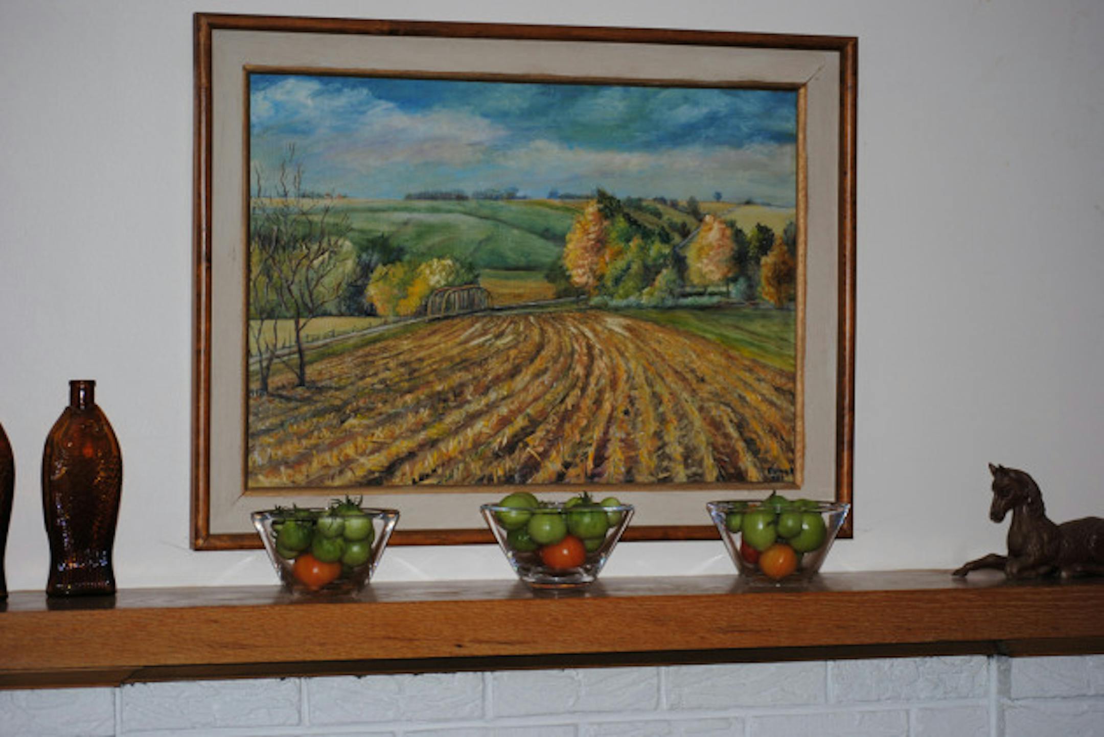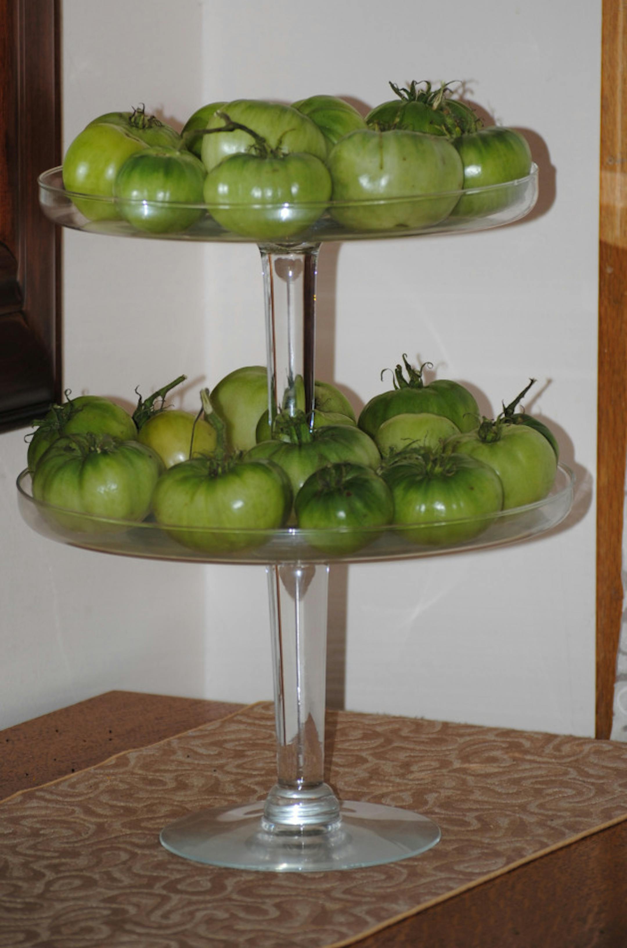 So this year I was inspired to take decorating with green tomatoes beyond the usual centerpiece bowl on the table. If vertical gardening is good for the back yard, I figured vertical storage could save me precious counter space, right? Out came the stackable cake pedestals on the dining room buffet, saving me at least two plates' worth on the counter. Encouraged by that bit of storage success, I plopped still more smaller green tomatoes in three matching bowls to form part of a fall-toned mantel arrangement. (I used glass partly for effect, and partly so I could more readily check on ripening progress, since the ones on the bottom ripen first.)