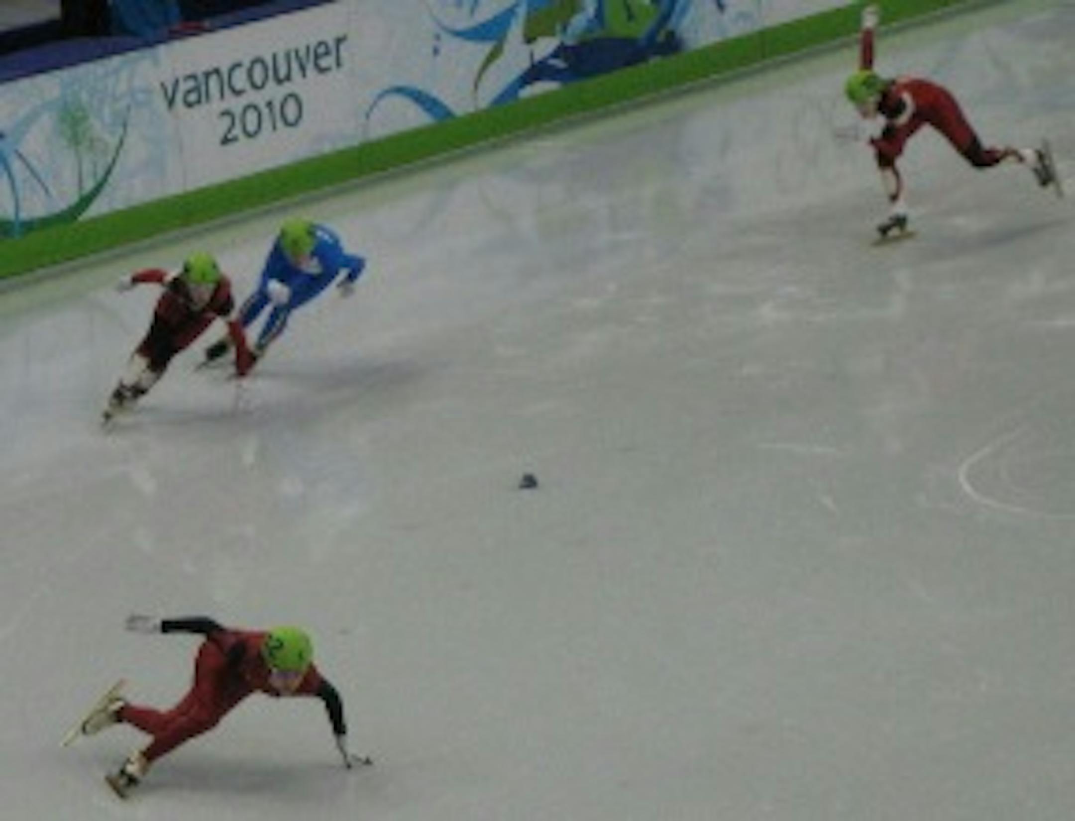 *All right, day 2 is in the bag! What started on an awful note with our entire day of snowboard tickets getting canceled ended on a positive with us scalping tix to the short track speed skating event at the pacific coliseum. We saw Apollo Ohno slaughter his heat in the Men's 1000M and Wang Meng just destroy the rest of the field to win the gold in the Women's 500M. The coolest thing though was the Men's 5000M relay where each team has 4 skaters on the ice at one time and they each skate 1.5 laps before they transition to another skater by skating in front of their teammate and then they push on each other's butts. nice! (Skating photo).