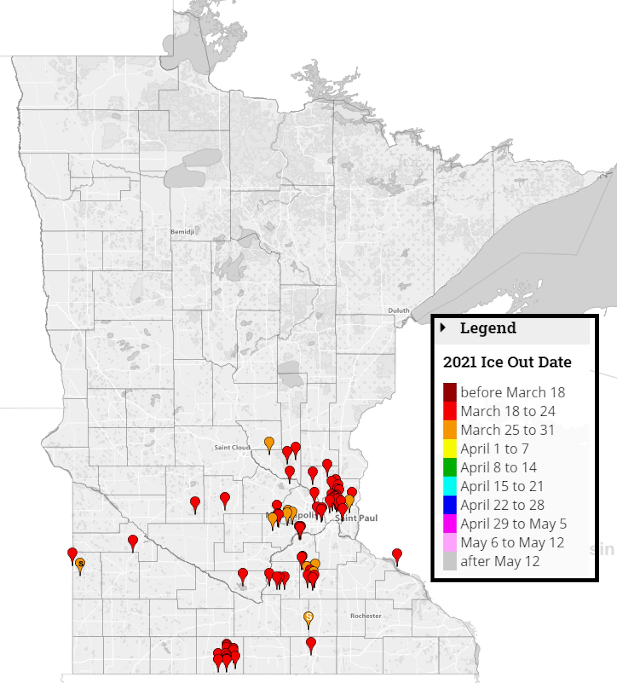Thanks to recent rains and warmer temps, several lakes across the southern half of the state have gone ice free including a few in the Twin Cities. Warm & windy weather on Monday will help to melt even more lake ice across the region, so I expect to see quite a few more lakes go ice out this week.