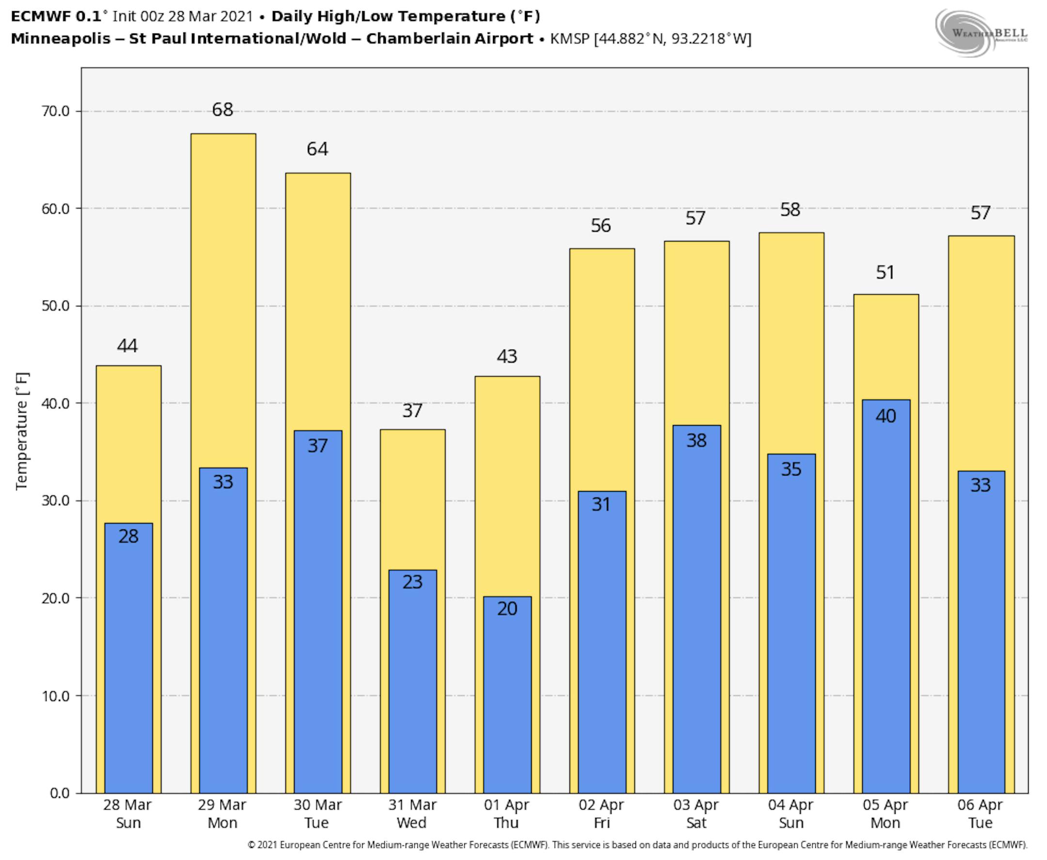 High temps on Monday will be very warm for the end of March. If fact, we could see our first 70F high of the year and the first 70F since November 8th, when MSP topped out at 72F. Note that our first 70F day of the year at MSP typically arrives around the 8th of April. Our earliest 70F day was on March 5th in the year 2000.