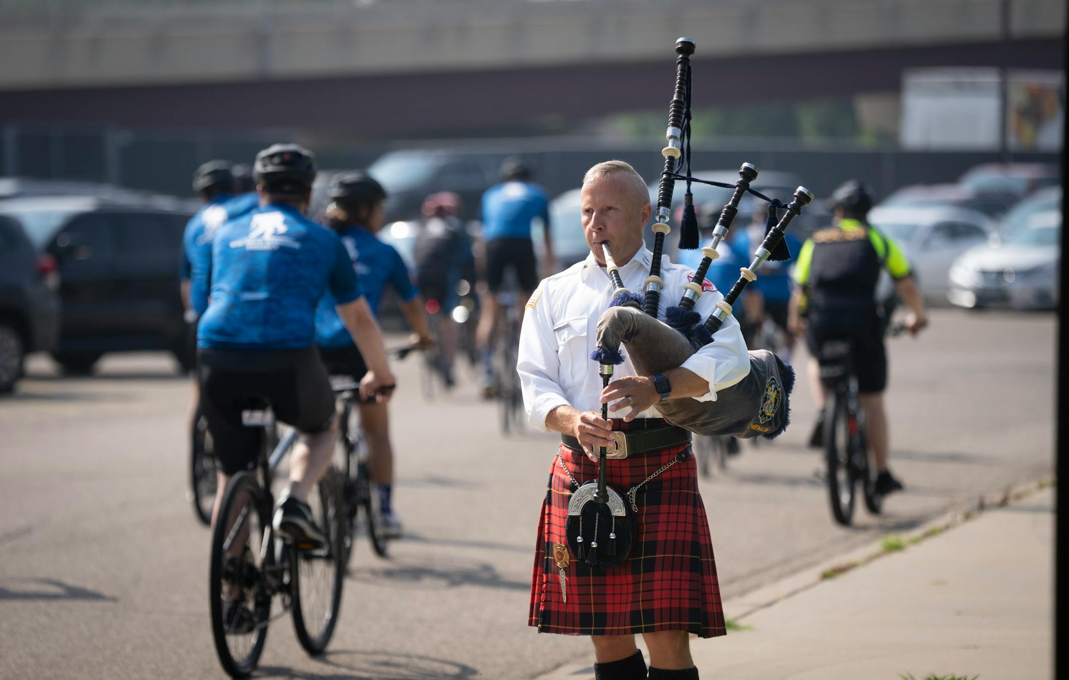 Then they wheeled off as St. Paul Fire Capt. Ben Schenck played the Marines’ Hymn on bagpipes from atop a fire engine ladder.