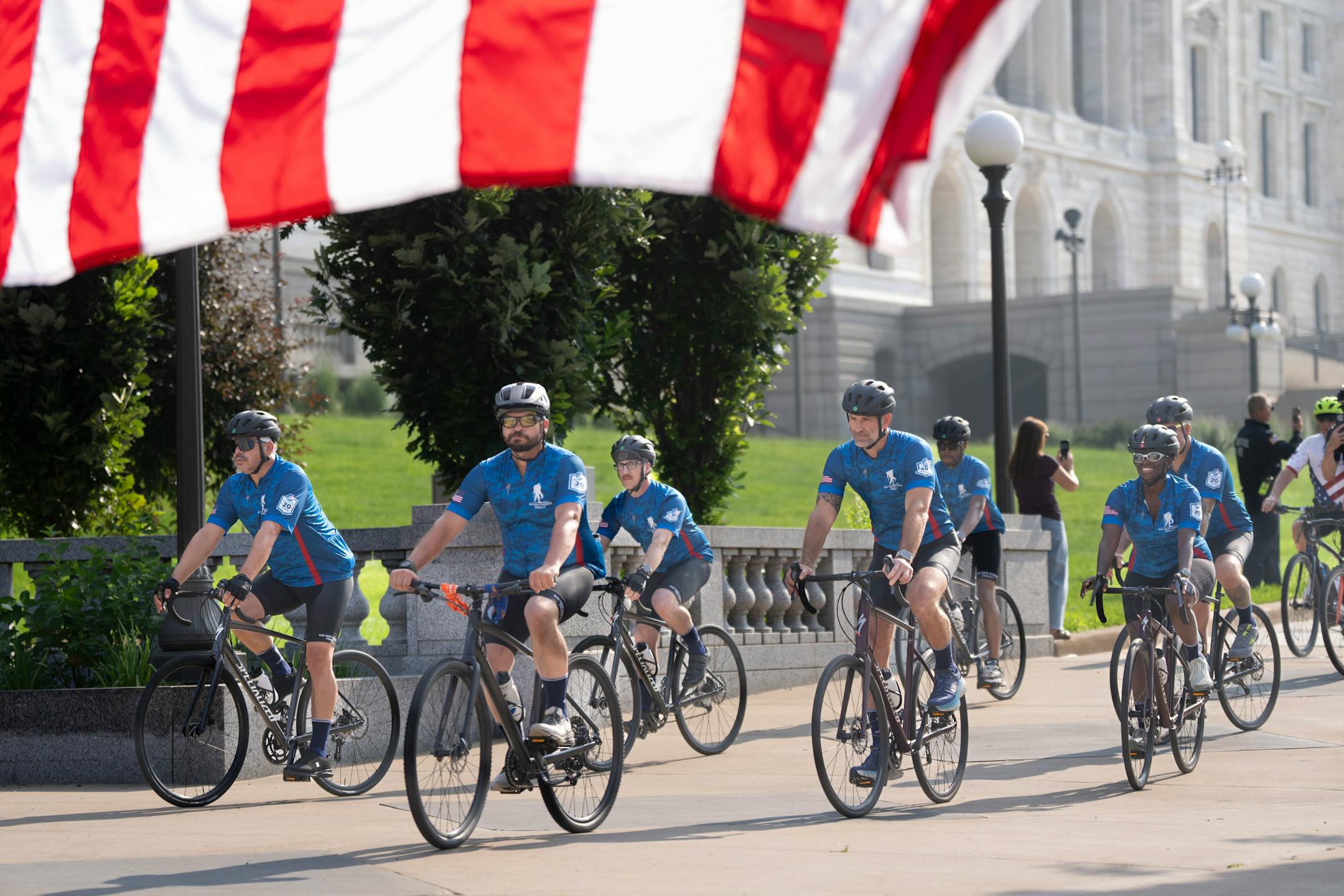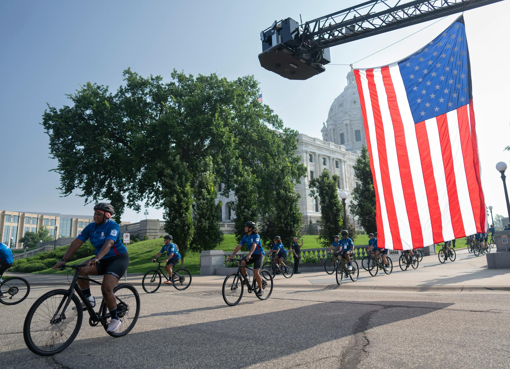 Warm air brushed the dew on the Capitol lawn as the veterans waved their arms to stretch. An escort of police officers, firefighters and medics looked on as state Public Safety Commissioner Bob Jacobson thanked the vets, saying that he “couldn’t be more inspired” by their service.