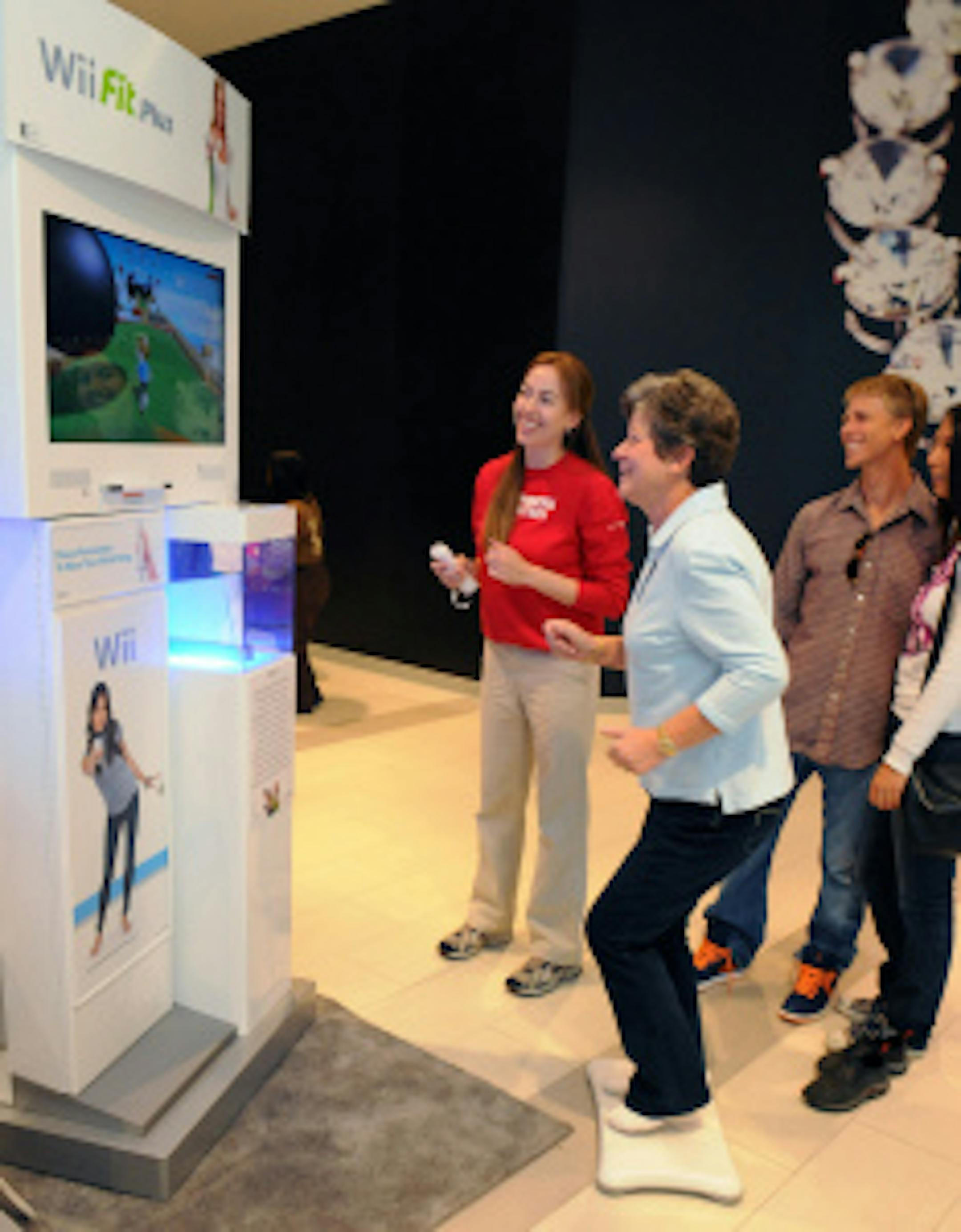 Pictured above: Kara L., 27, and boyfriend Sean G., 34, of Los Angeles, encourage Sean's mom, Carole G., 65, of Austin, as she breaks a sweat with the Obstacle Course game on Wii Fit Plus during a Black Friday shopping excursion at Westfield Culver City in Culver City, Calif. (Nintendo)
