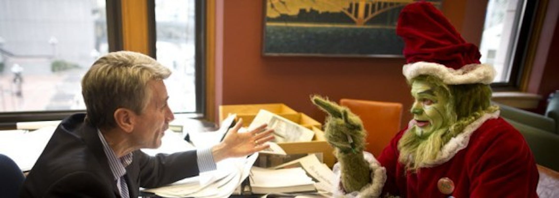 As a promotion for the Children's Theater Show "How the Grinch Stole Christmas," the Grinch himself asked Mayor R.T. Rybak to do away with the holiday. Rybak refused, but agreed to a compromise ban on fruitcake.