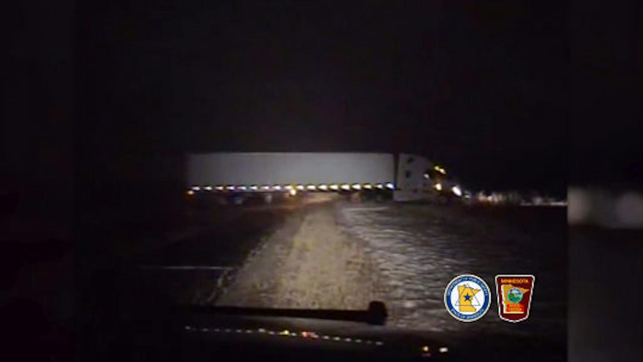 Earlier this month, the driver of a semi traveling a highway speeds lost control on icy Hwy. 55 near Barnes Avenue in Inver Grove Heights and careened into the ditch, narrowly missing a state trooper's squad parked on the right shoulder. A trooper's dashcam caught the dramatic action.