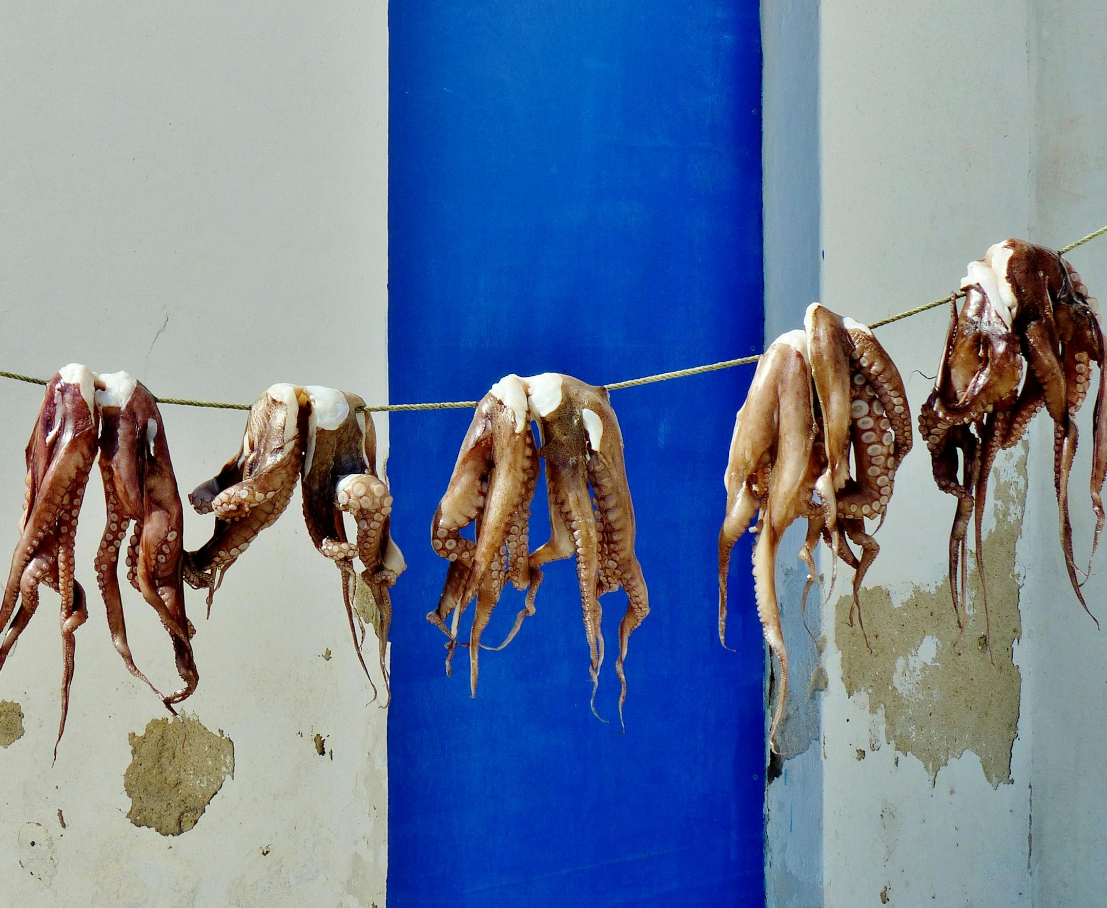 The scene: Eight-limbed mollusks (octopuses, that is) hang out behind a restaurant on an iconic Greek isle.