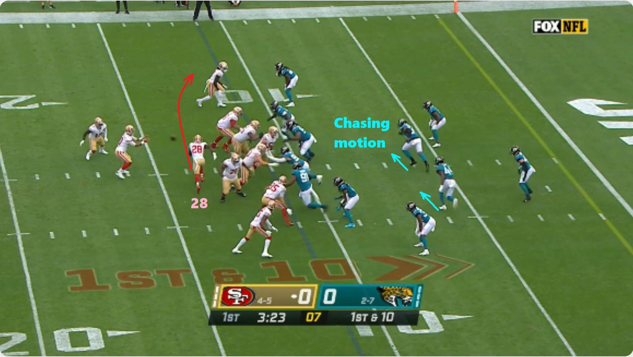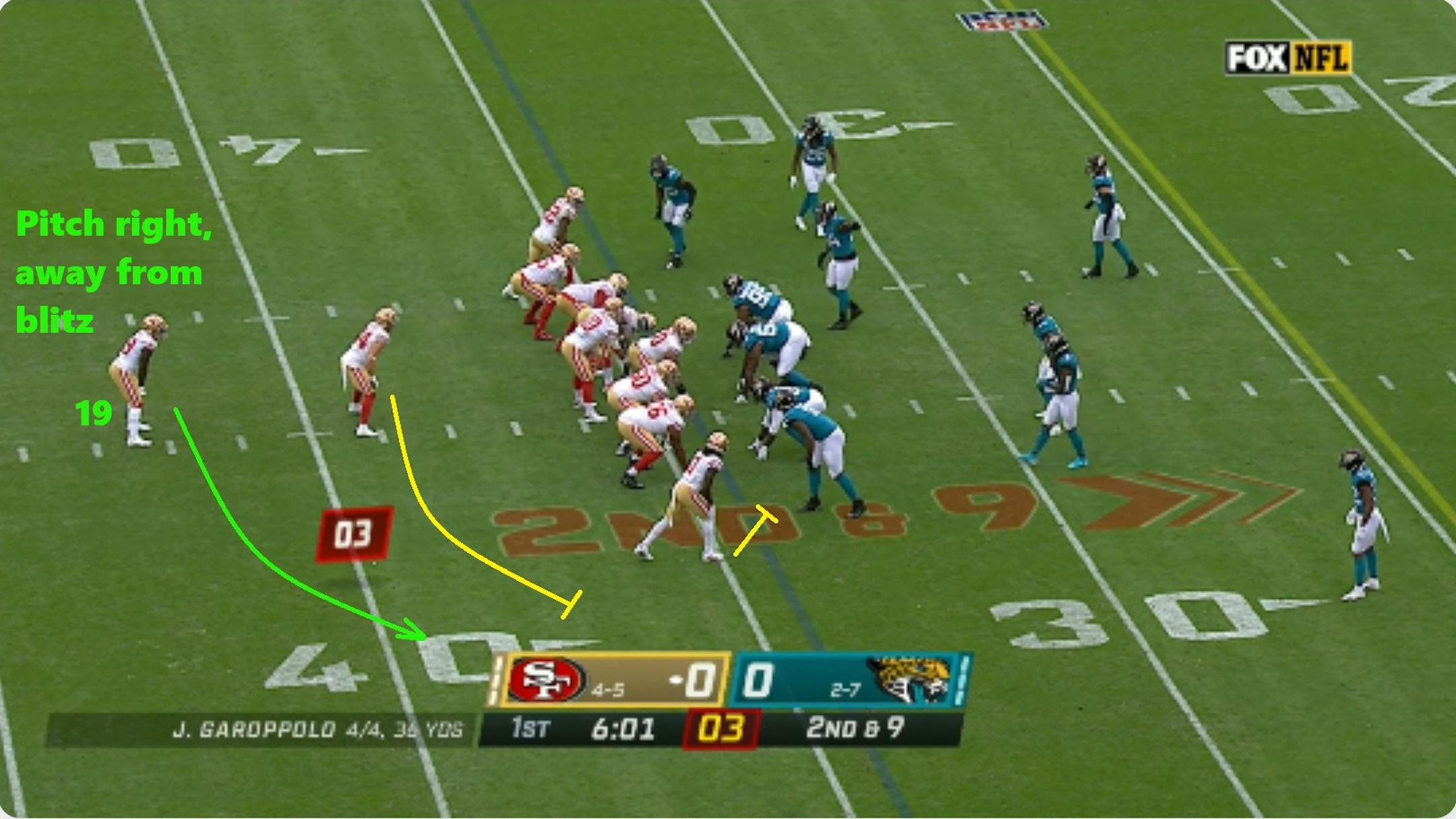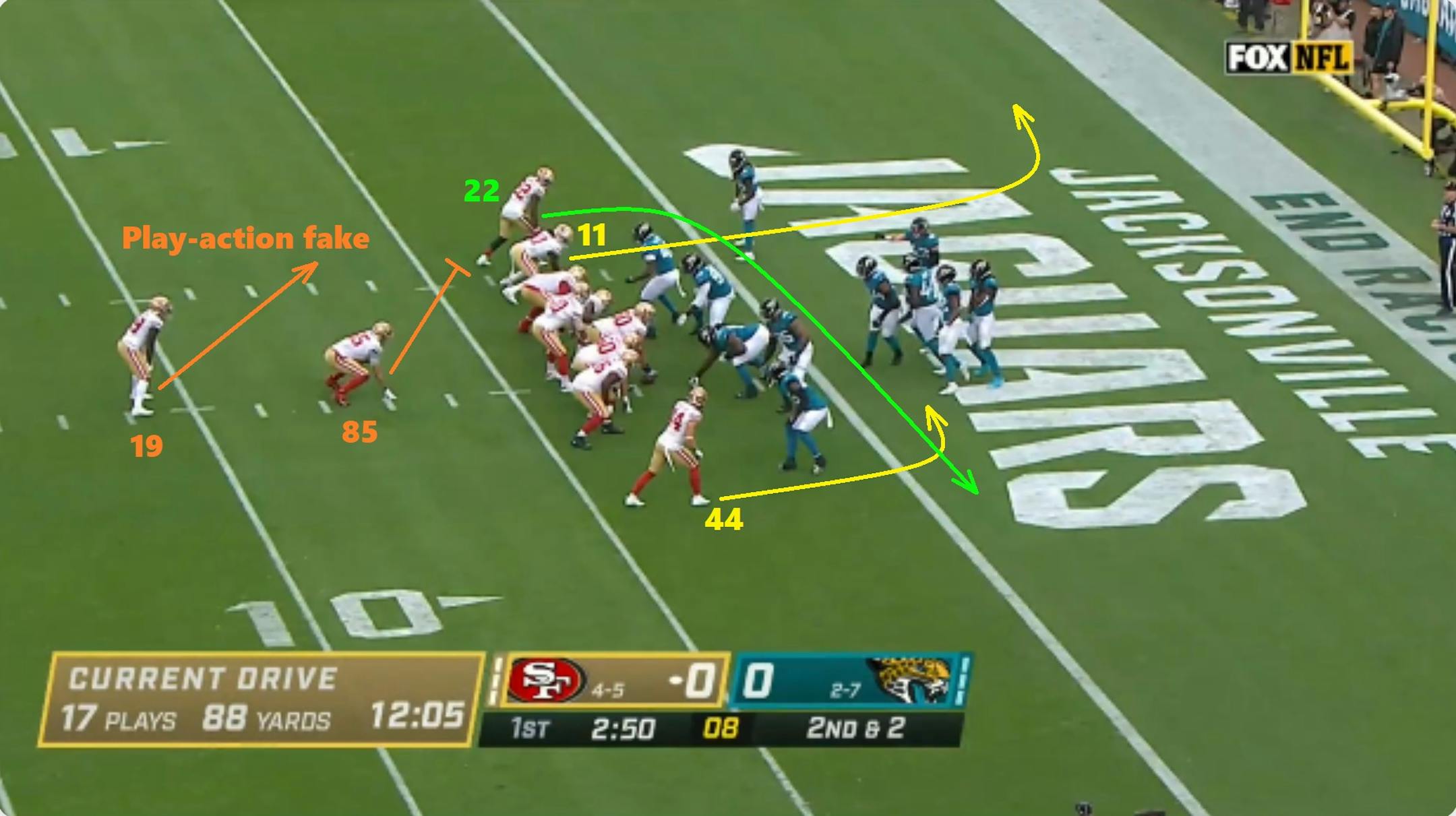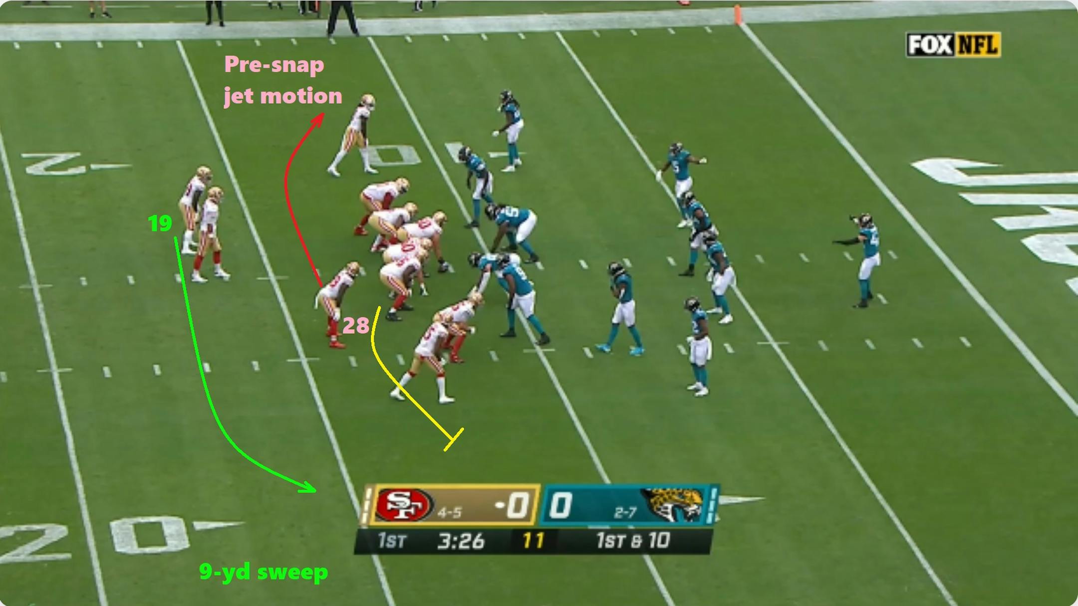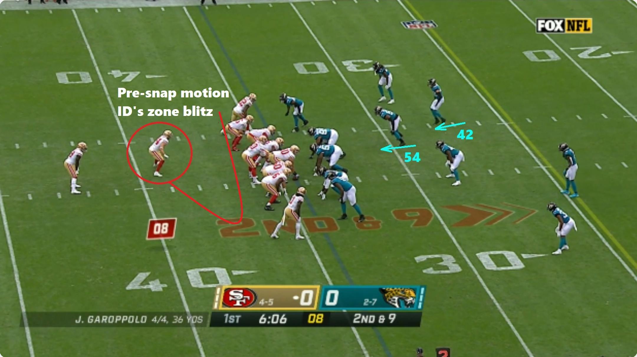 The 49ers take some elements to the extreme, particularly play fakes and pre-snap motion. Shanahan's teams have led the league in pre-snap motion rates every year since he took over in 2017. Early movement and misdirection help 49ers quarterback Jimmy Garoppolo to identify and throw off defenses, while also setting up a run-heavy attack.