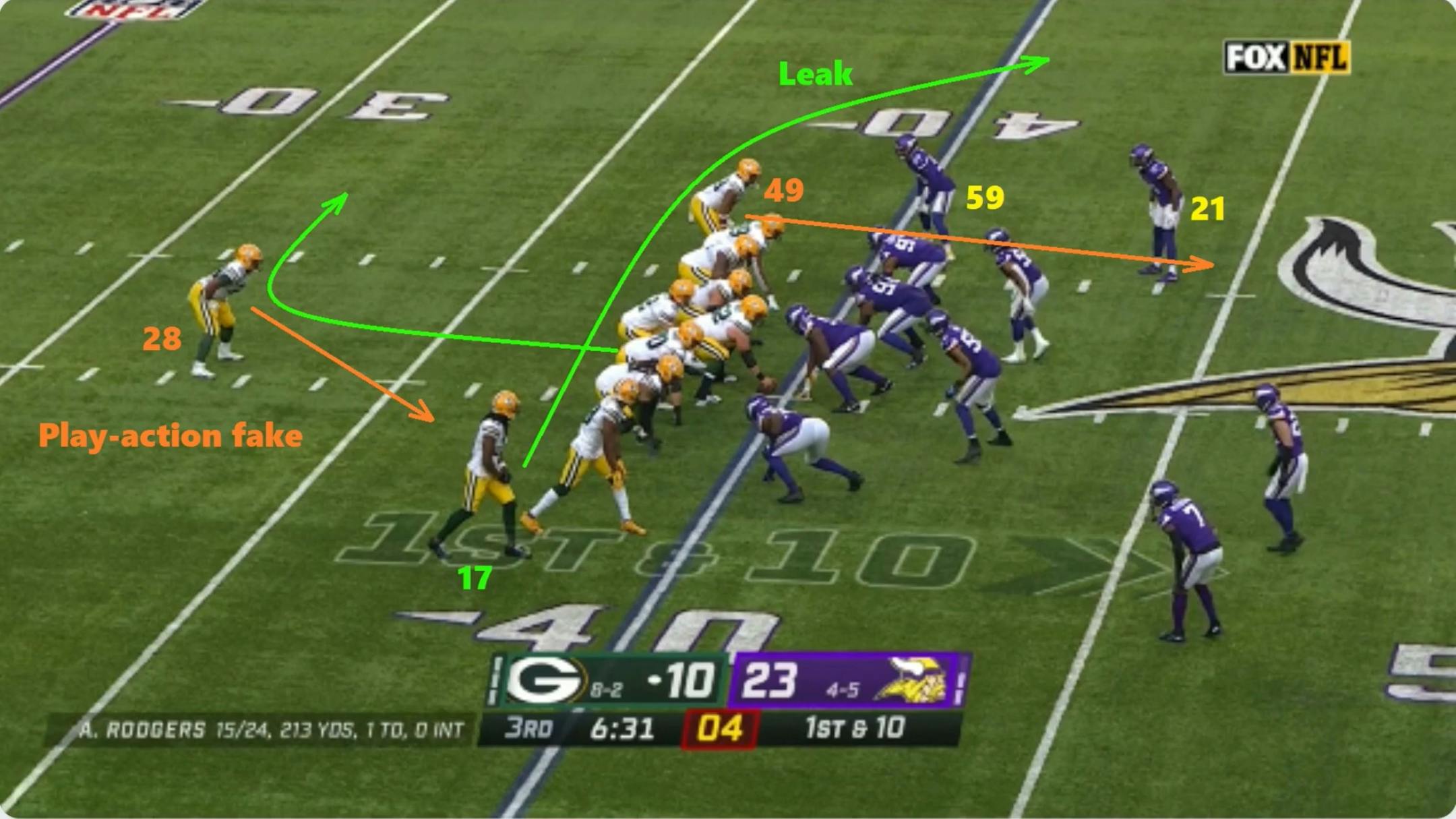 After Adams beat Peterson on a comeback route for 12 yards, Rodgers seems to check the Packers into this play fake. The Vikings' eagerness to cover Adams, with both Peterson and safety Harrison Smith looming over the top, plays into a 17-yard catch and run.