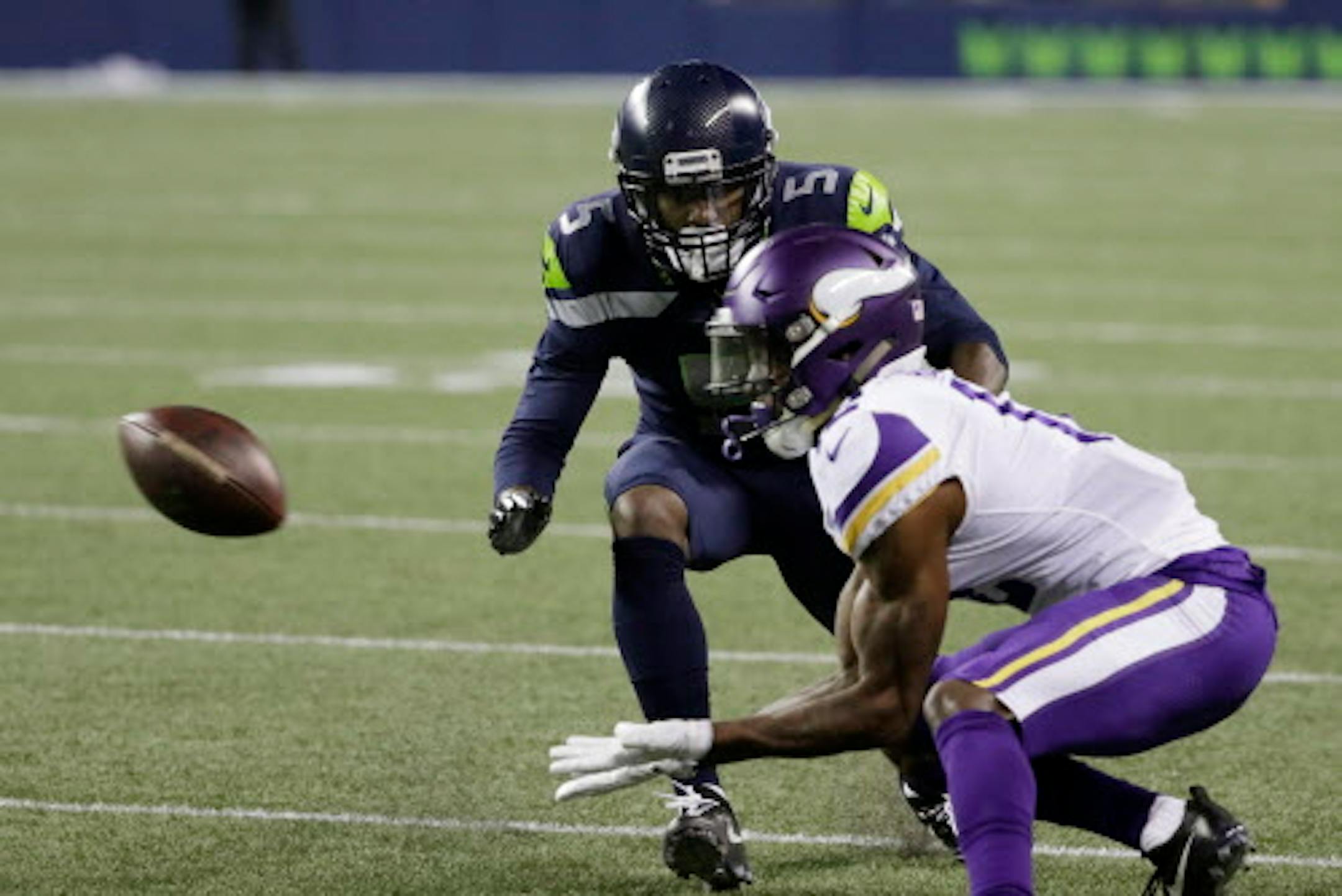 Seattle Seahawks cornerback Tramaine Brock (5) defends as Minnesota Vikings wide receiver Rodney Adams, right, makes a low catch in the second half of an NFL football preseason game, Friday, Aug. 18, 2017, in Seattle. (AP Photo/Stephen Brashear)