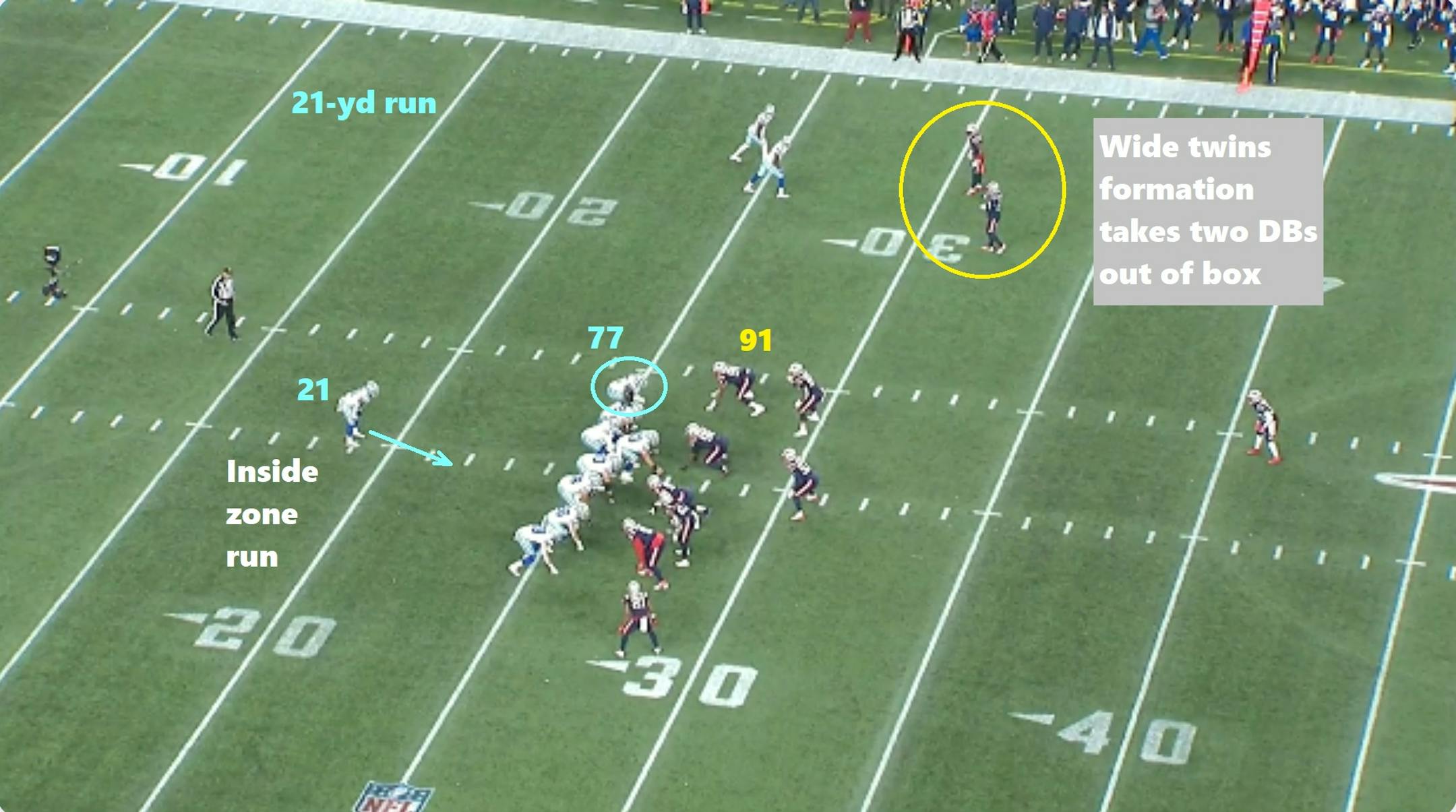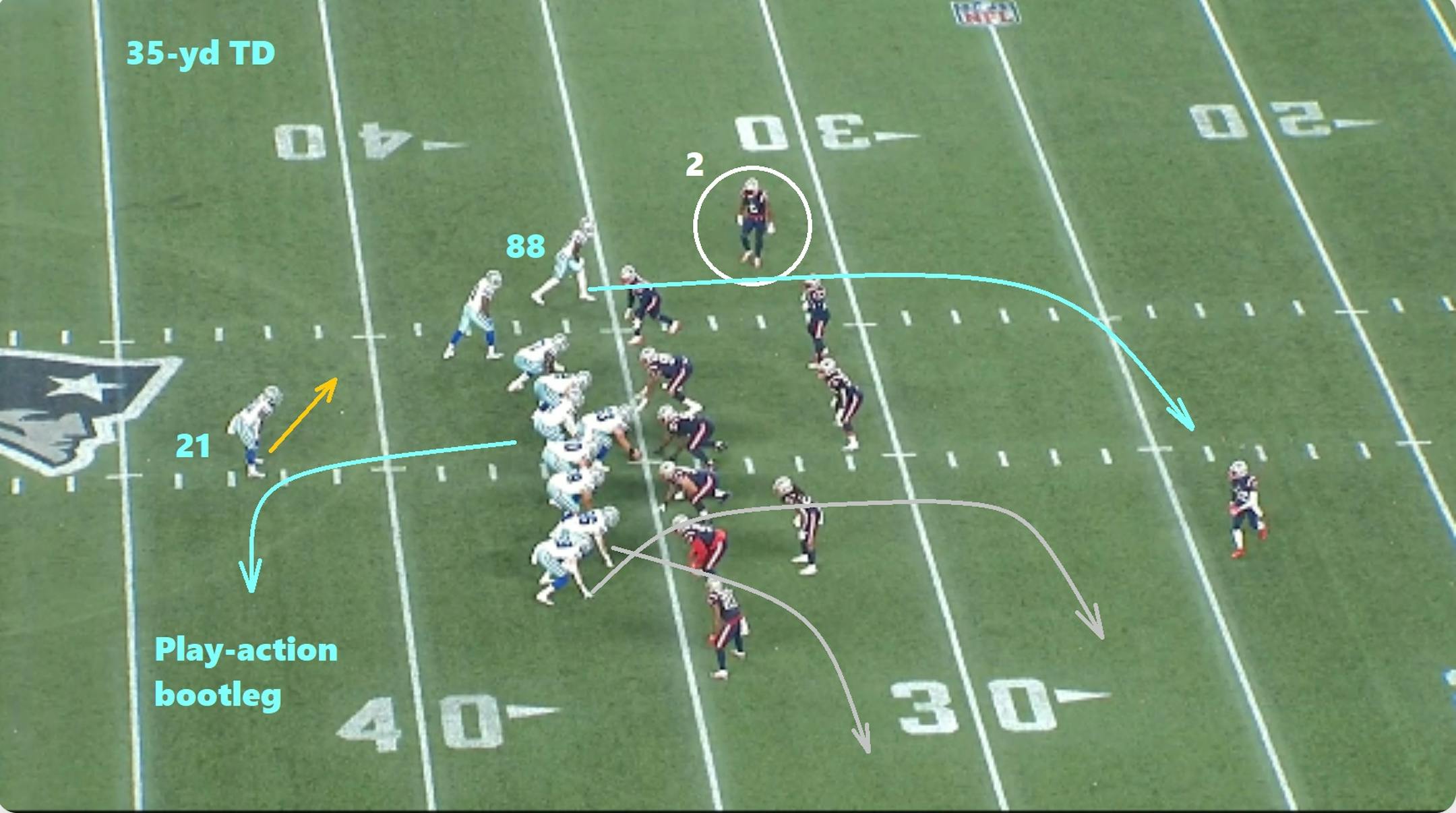 Receiver CeeDee Lamb (#88) is talented enough to win one-on-one matchups, but he and the rest of Prescott's targets benefit from a feared running game that's among the league's most efficient with Elliott and speedy backup Tony Pollard. So when the Cowboys marched into Patriots territory in overtime, New England loaded up to stop what is typically a conservative running play to set up a field goal. But Cowboys coordinator Kellen Moore dialed up a play-action dagger on first down.
