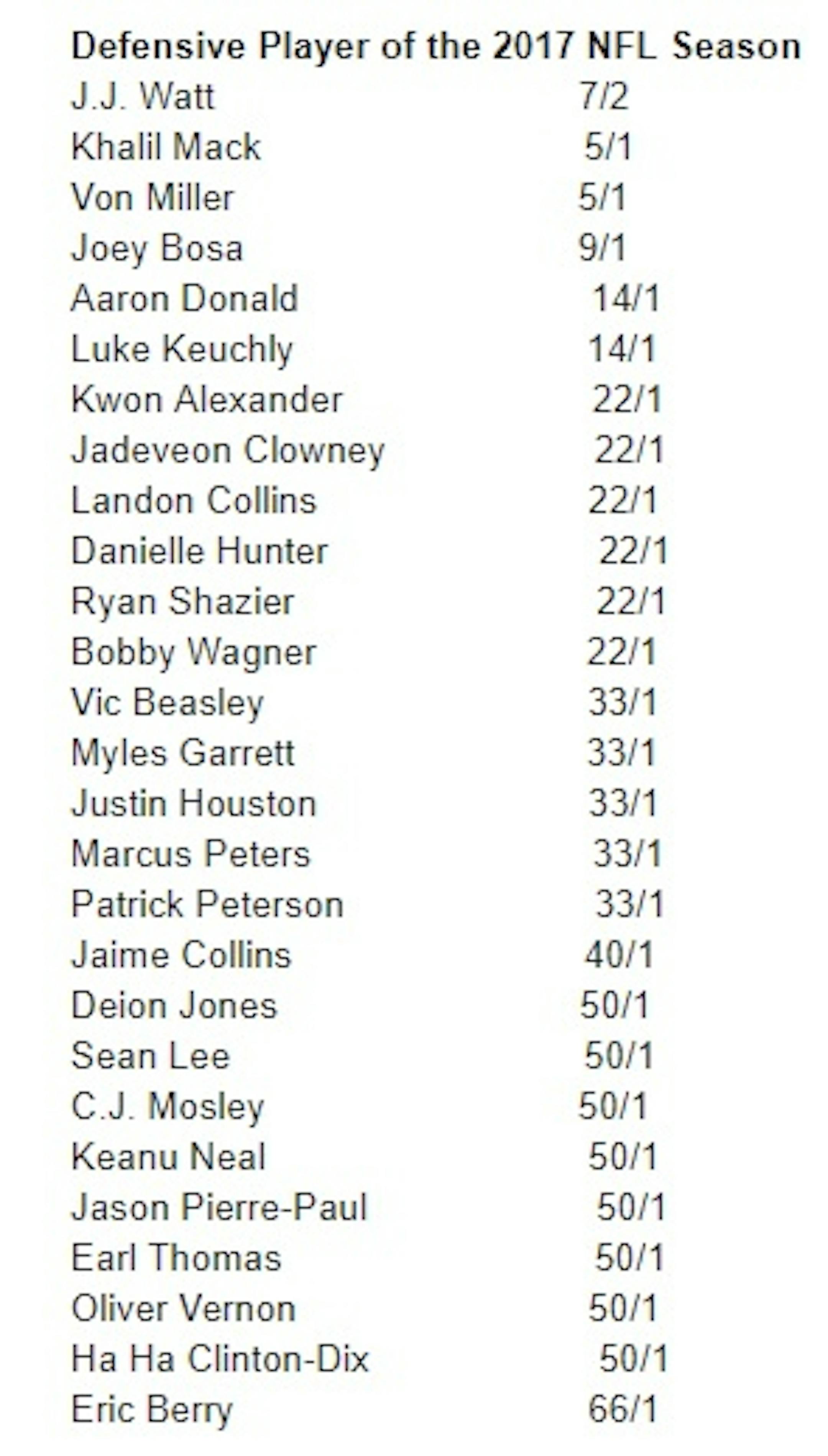 With odds of 22-1, Hunter, the Vikings third-year defensive end, trails only J.J. Watt, Khalil Mack (5-1), Von Miller (5-1), Joey Bosa (9-1), Aaron Donald (14-1) and Luke Kuechly (14-1). Watt is the favorite at 7-2.