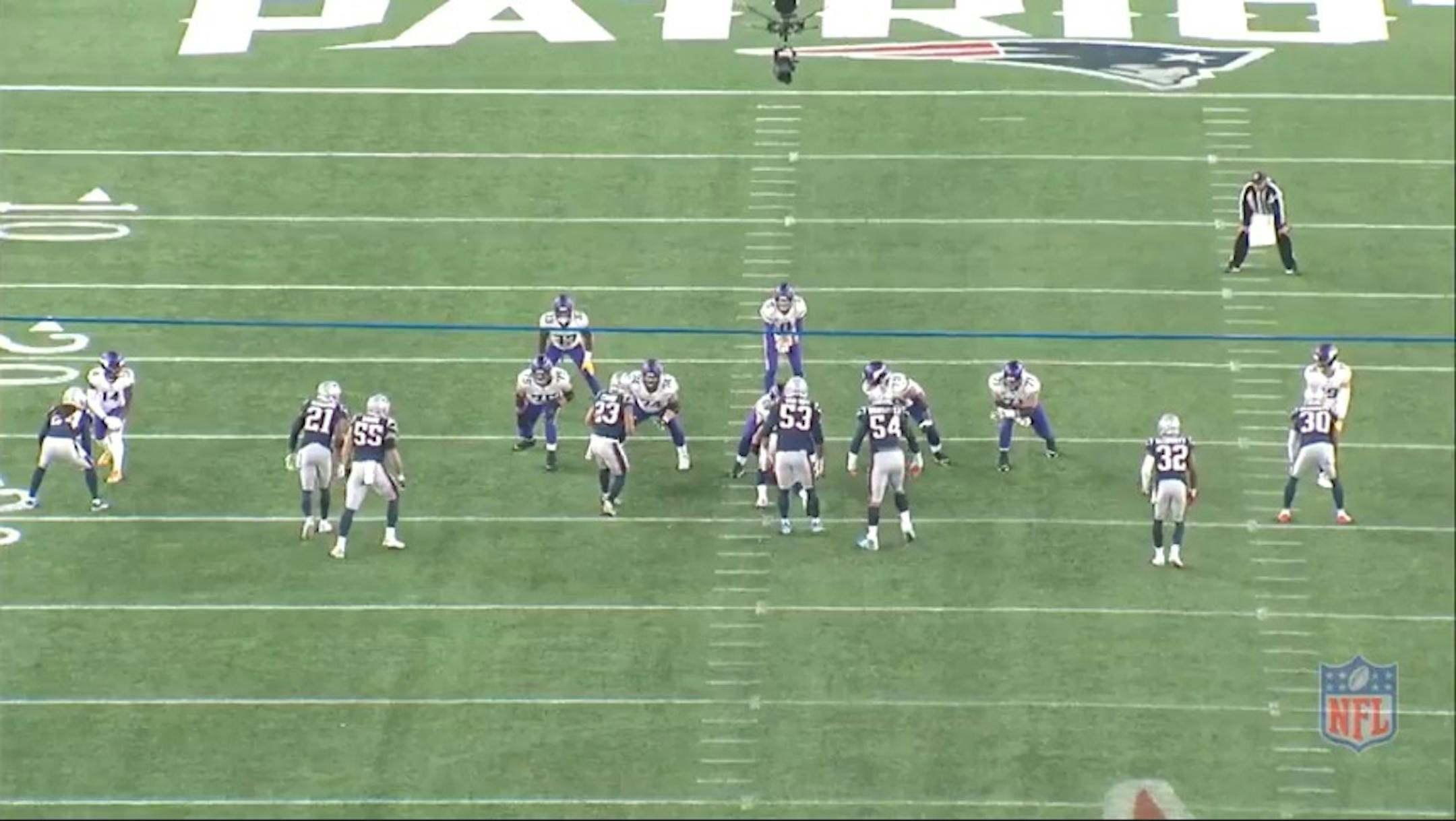 1. Pressure report: The Patriots' blitzes were the story of the game out of Boston media. But really, Cousins wasn't awful against extra rushers. Against 10 blitzes, Cousins completed 6 of 9 passes for 62 yards and four first downs. One incompletion was a Thielen drop. He did take one critical sack on this third-and-5 to open the fourth quarter. But the O-line gave him little time on this play below.