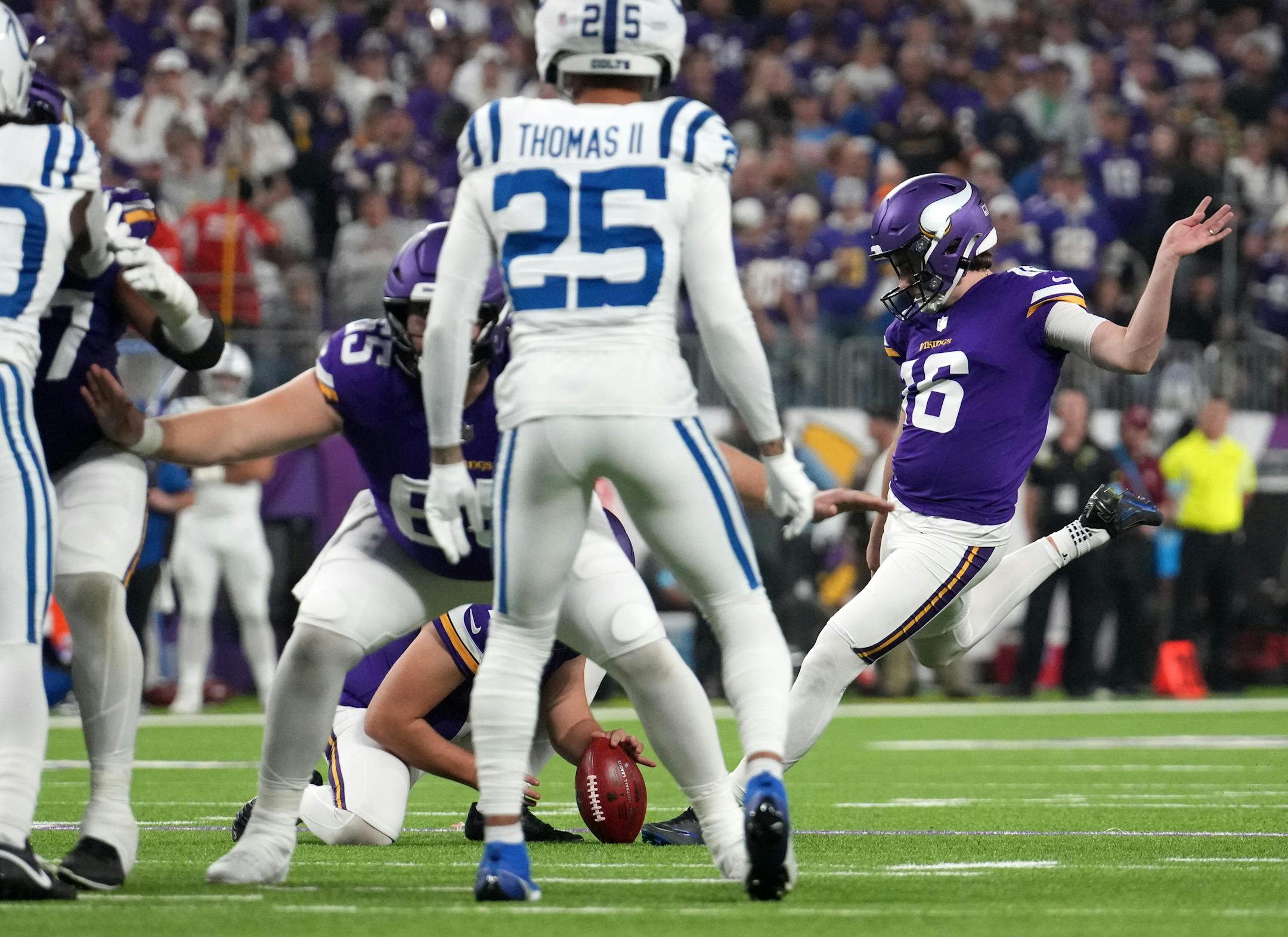 The team is “still evaluating” Reichard’s right quad after the rookie kicker strained his leg during Sunday night’s 21-13 win over the Colts. Reichard told the Minnesota Star Tribune that he had been “dealing with a little bit of soreness the last week or so,” and that he further strained his leg sometime during the first half. Reichard had made 34 straight kicks to begin his NFL career before missing field goal attempts of 53 and 31 yards against the Colts.