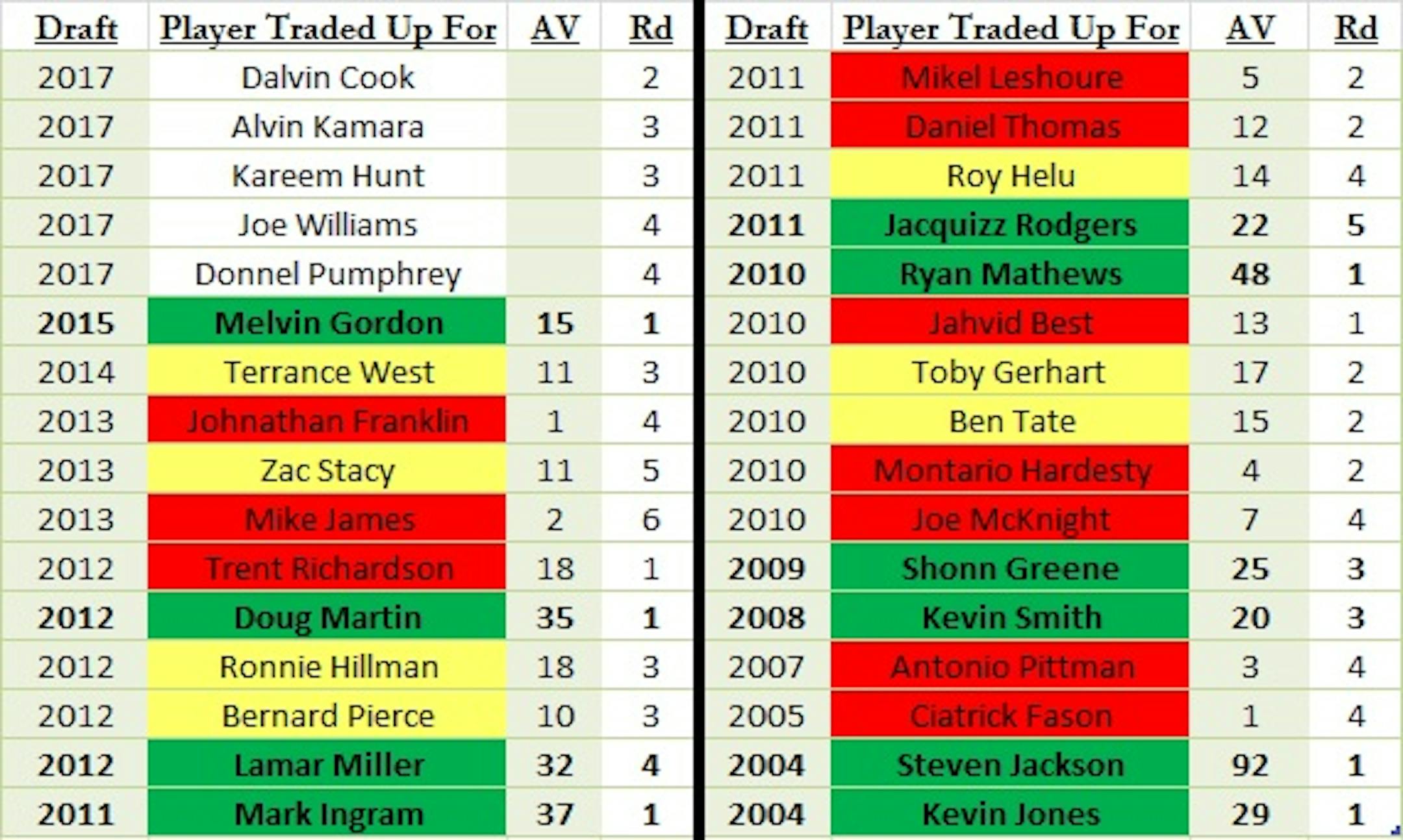 The second round hasn't been as fruitful as the first for ambitious teams. Cook would be the first running back acquired via second-round trade up to make much of an impact in the NFL since 2000. His second-round trade up predecessors include unheralded players like Mikel Leshoure (2011), Daniel Thomas (2011), Toby Gerhart (2010), Ben Tate (2010) and Montario Hardesty (2010).