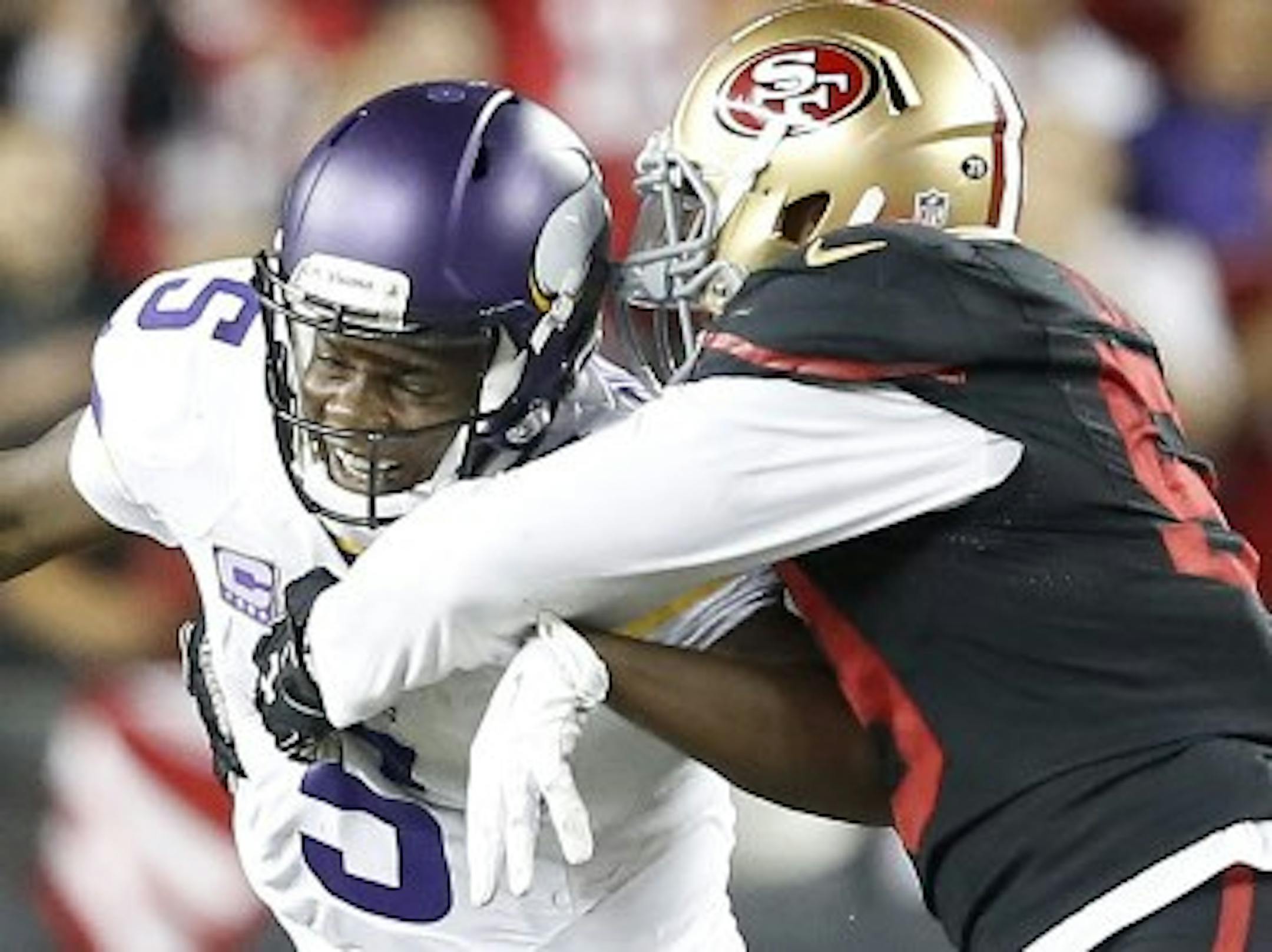 *The Vikings gave up 4.3 yards per carry and nearly 2,000 yards rushing last season, numbers that ranked in the bottom third of the NFL and made coach Mike Zimmer upset. There was optimism going into the year that the run defense would be better based on better linebacker play, but that certainly was not the case Monday. Carlos Hyde (who looked great, by the way) ran every which way over and through the Vikings for 168 yards and a pair of TDs. San Francisco as a team almost averaged 6 yards per carry. So consider the run defense a primary concern again. The defense did keep the 49ers to 10 points through three quarters, though, and can't be considered the primary culprit in last night's defeat.