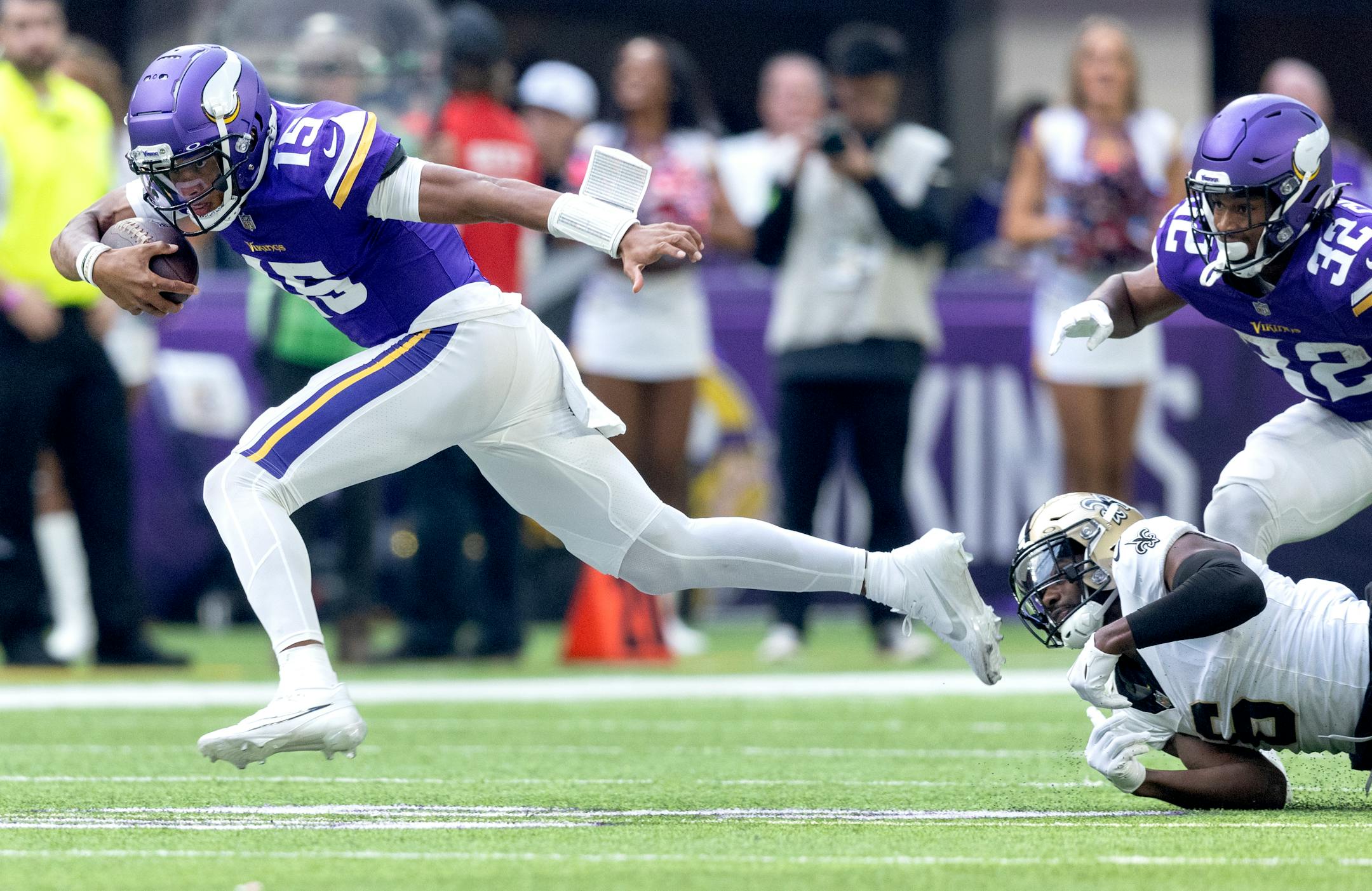 On Sunday at U.S. Bank Stadium, Dobbs helped the Vikings defeat the Saints 27-19 by producing a rushing touchdown and a passing touchdown. Through a little more than a game and a half in the Vikings lineup, he has produced five touchdowns and a two-point conversion without throwing an interception.