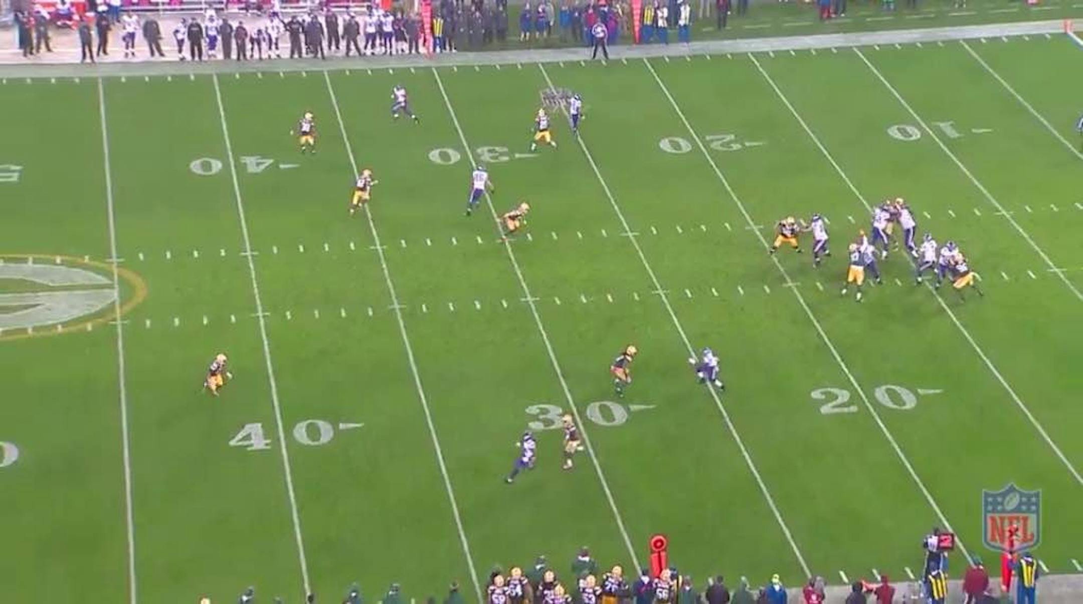 The situation: The Vikings are down 21-0 to the Packers with 6:40 left in the first half. They're facing a 2nd and 8 on their own 22 and elect to pass.