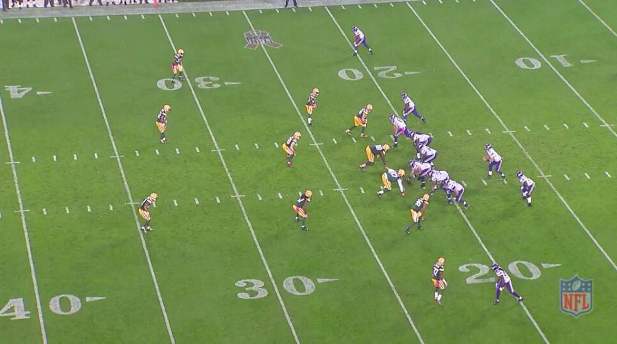 The Vikings are lined up in 11 personnel, meaning one running back and one tight end, with two receivers on the right and wide receiver Cordarrelle Patterson alone on the left. The Packers counter with their 3-4 nickel defense, with two down linemen and linebackers Clay Matthews and Julius Peppers standing up rushing from the ends. Cornerback Casey Hayward is in the nickel covering Greg Jennings in the slot.