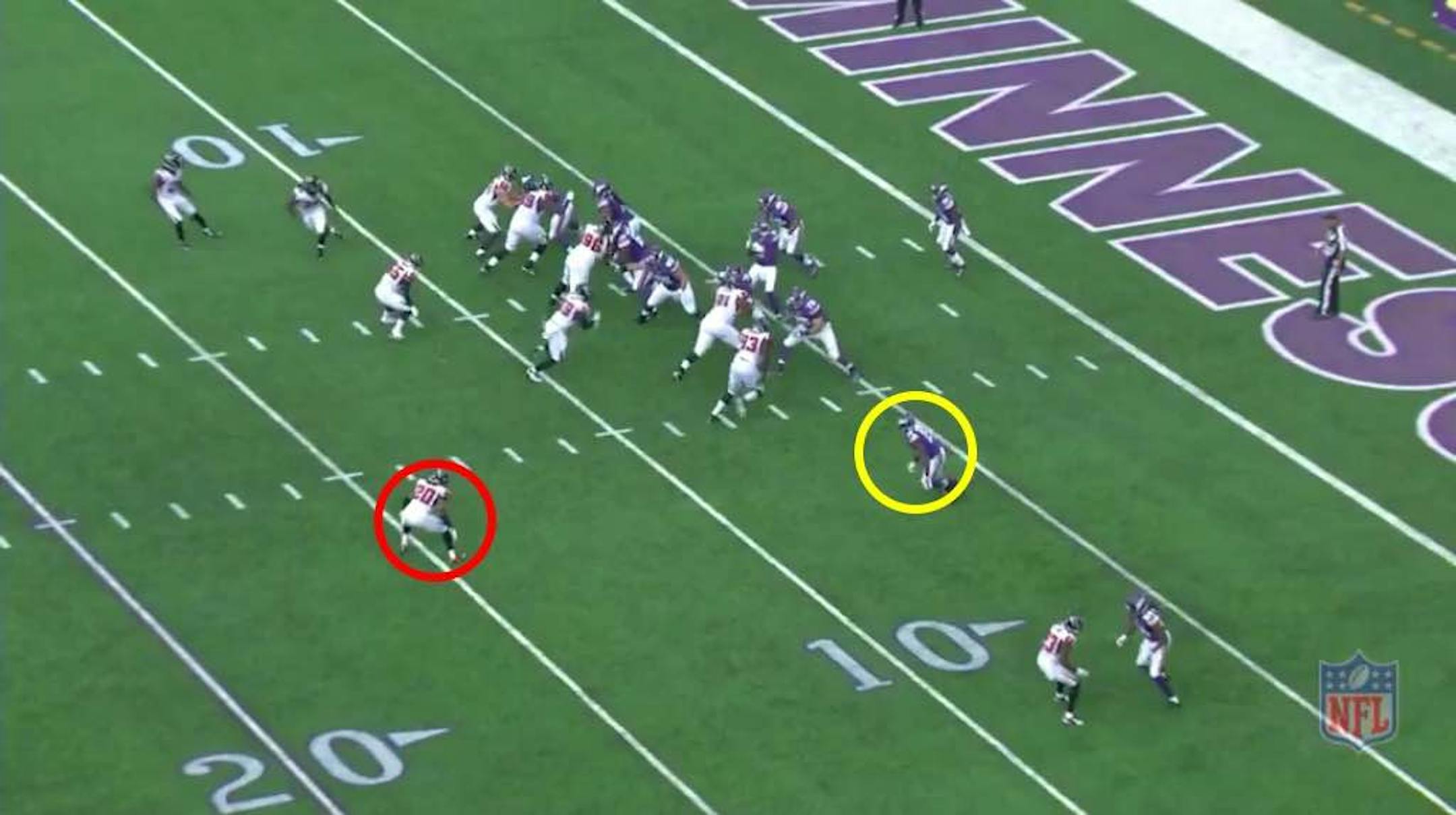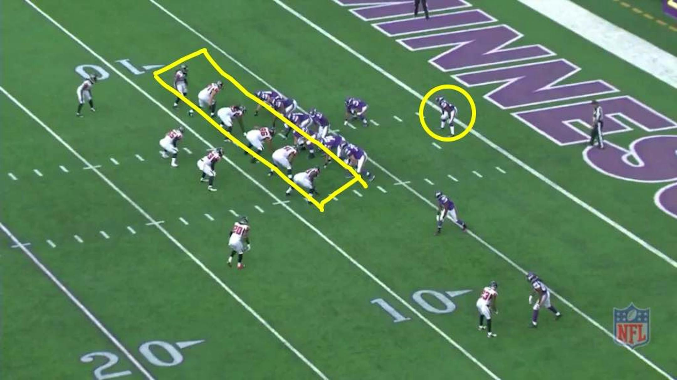 The Vikings are lined up in an offset "I" formation, with Felton lined up to the right of rookie quarterback Teddy Bridgewater, in a 21 personnel (two backs and one tight end). It'd be considered "strong right" because of Felton's alignment and tight end Rhett Ellison also lined up on the right side of the line of scrimmage. With McKinnon (circled in yellow) in the backfield, the Falcons stack the box with six near the line of scrimmage. They're sensing run with the Vikings personnel.