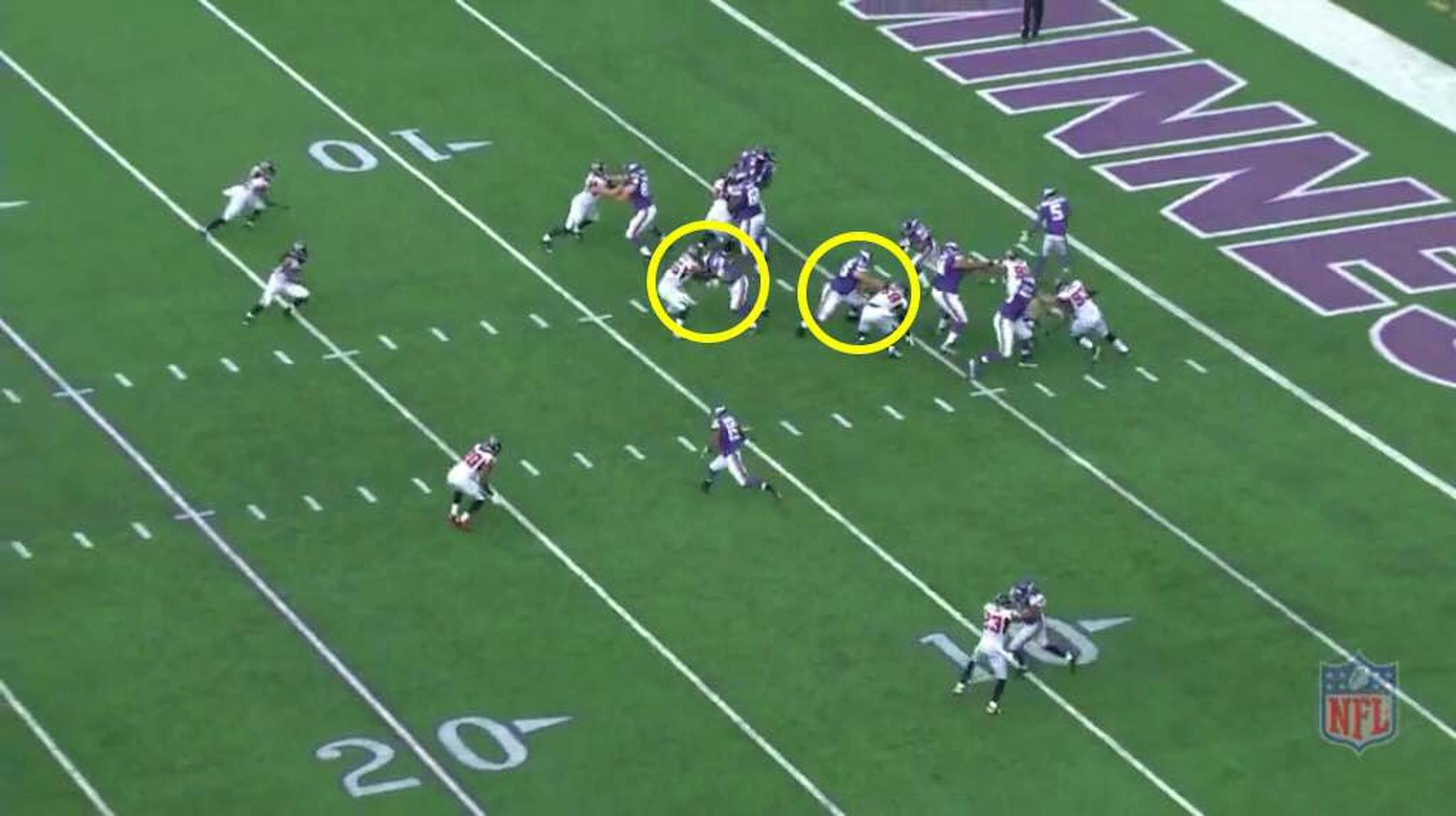Instead, it's a delayed "iso draw" with McKinnon receiving the hand off after Bridgewater sells the pump fake. The Vikings did a great job blocking, particularly Felton (circled in yellow on the left) and center John Sullivan (circled in yellow on the right). They clear the entire "A" gap for McKinnon by sealing linebackers Joplo Bartu and Paul Worrilow.