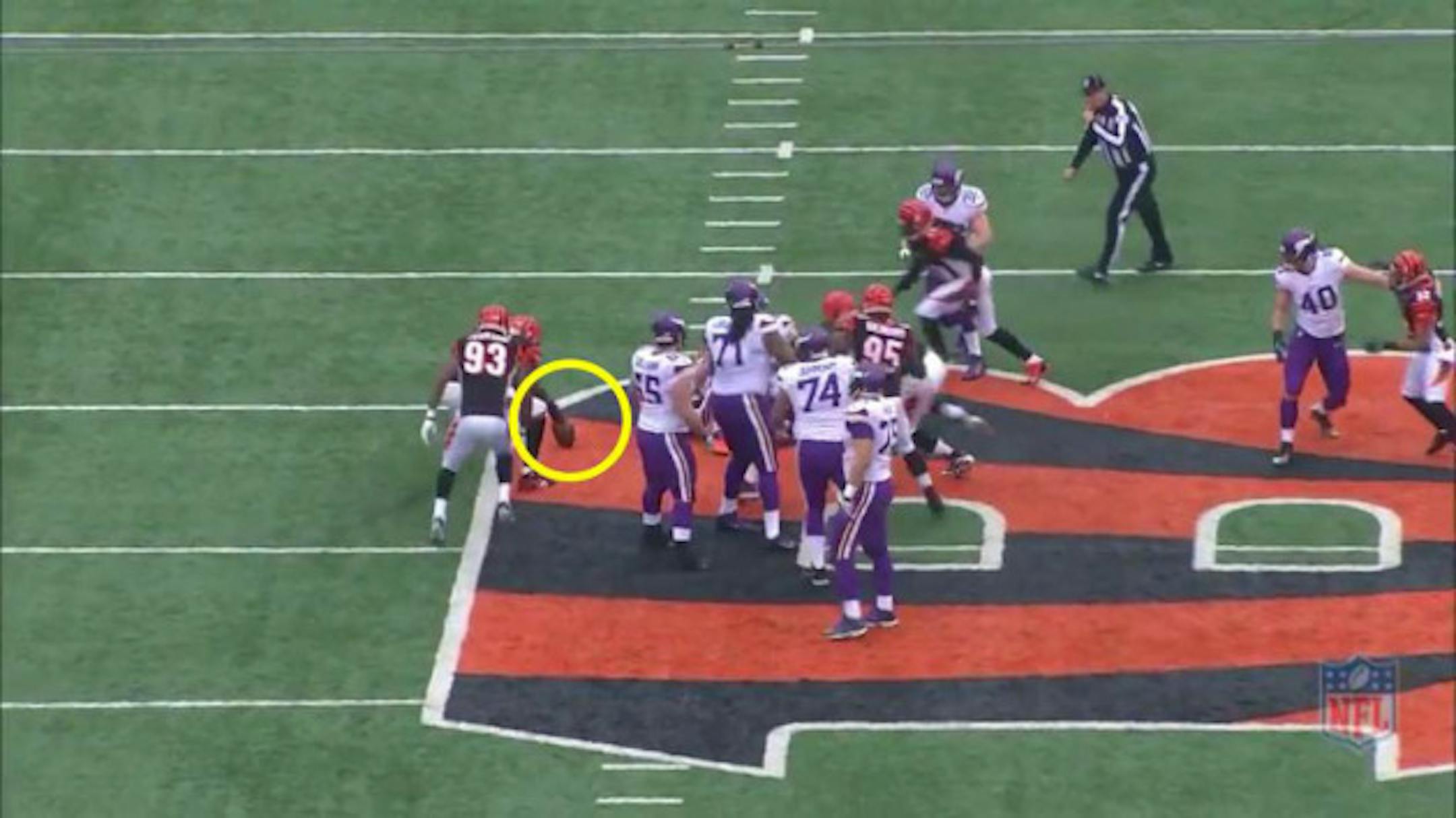 The result: Cassel fumbled while he was sacked. Bengals defensive end Carlos Dunlap recovered the loose ball and returned it 46 yards to the Vikings' 4. Bengals running back BenJarvus Green-Ellis scored two plays later.