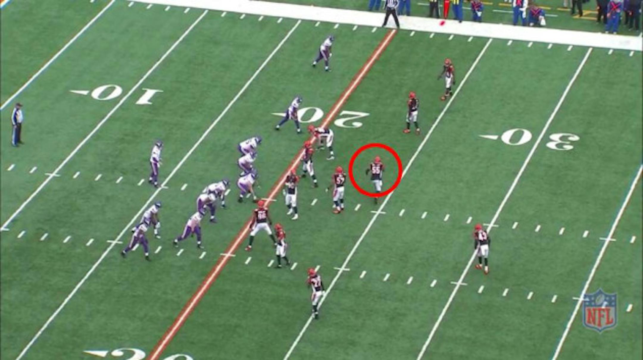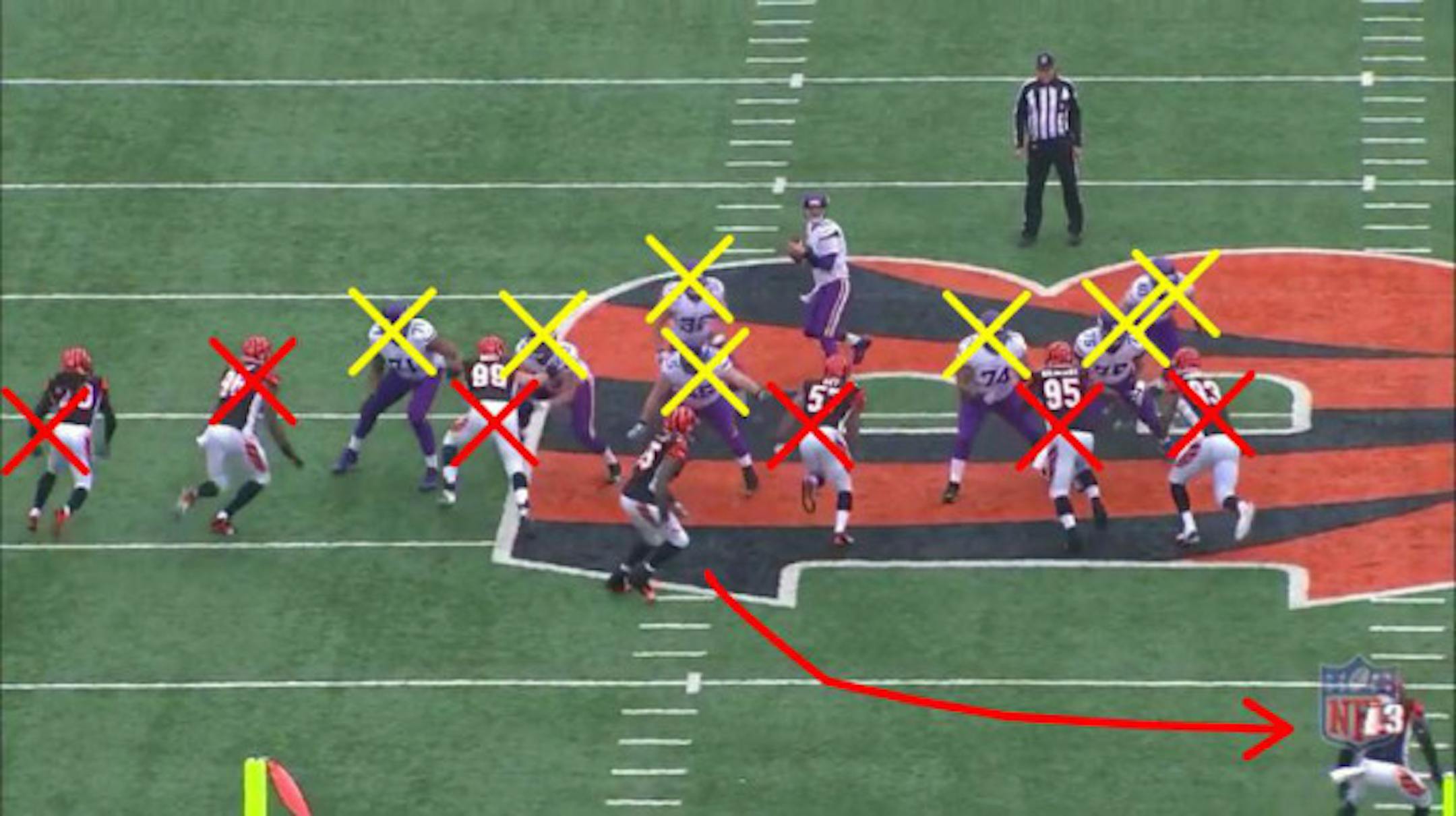 As Cassel drops back, the Bengals bring six defenders (marked with red "x"), but it shouldn't be a problem with seven blockers (marked with yellow "x"). Bengals linebacker Vontaze Burfict drops in coverage just as the ball is snapped.