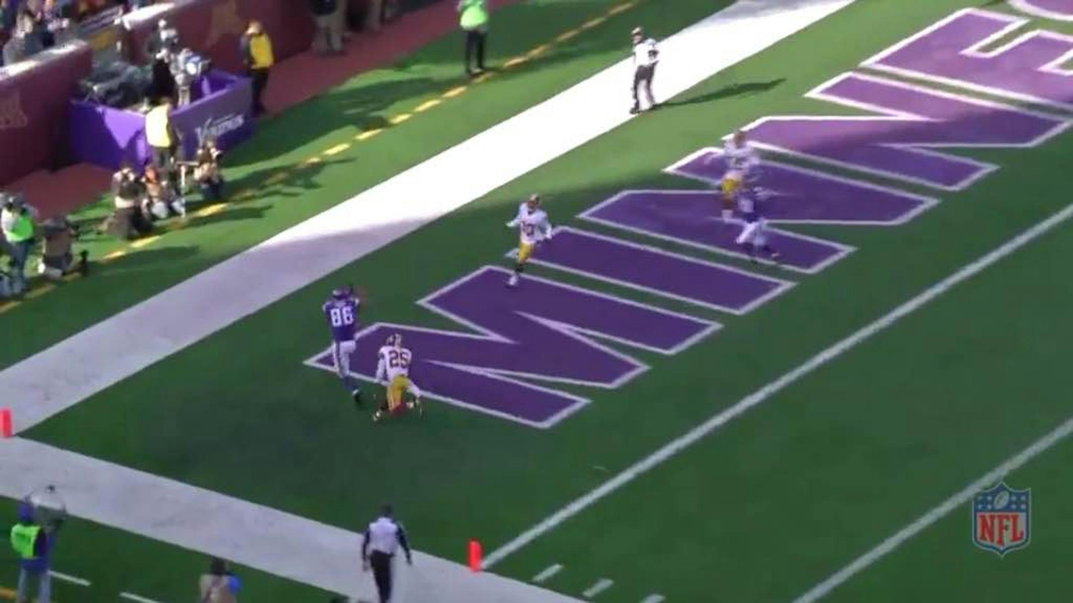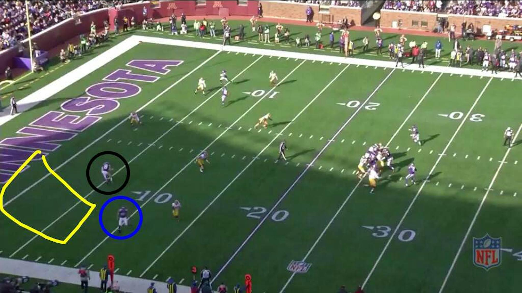 Ford (circled in blue) ran about a 10-12 yard corner route that would've gotten a first down, but Bridgewater saw an open hole in the end zone. Washington cornerback David Amerson was out of position attempting to jump wide receiver Adam Thielen's post route (circled in black), and he collided with Thielen right as he made his break. With the safety playing underneath Ford, it created that wide gap (circled in yellow) in the corner of the end zone.