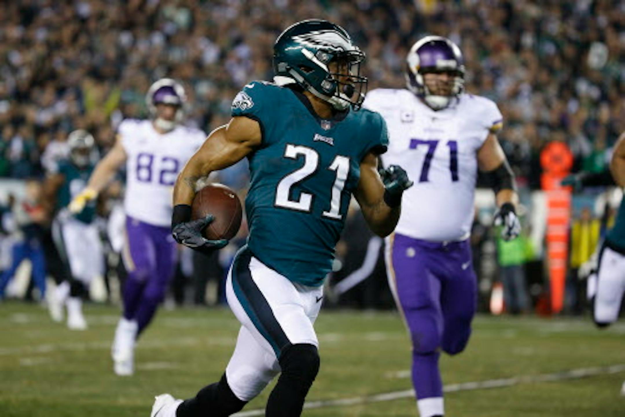 Keenum later was smacked by Derek Barnett after tight end David Morgan whiffed on a block that let Barnett run free. The stripped ball was recovered by Long and set up a seven-play, 76-yard drive capped by a 53-yard deep ball to Alshon Jeffery.