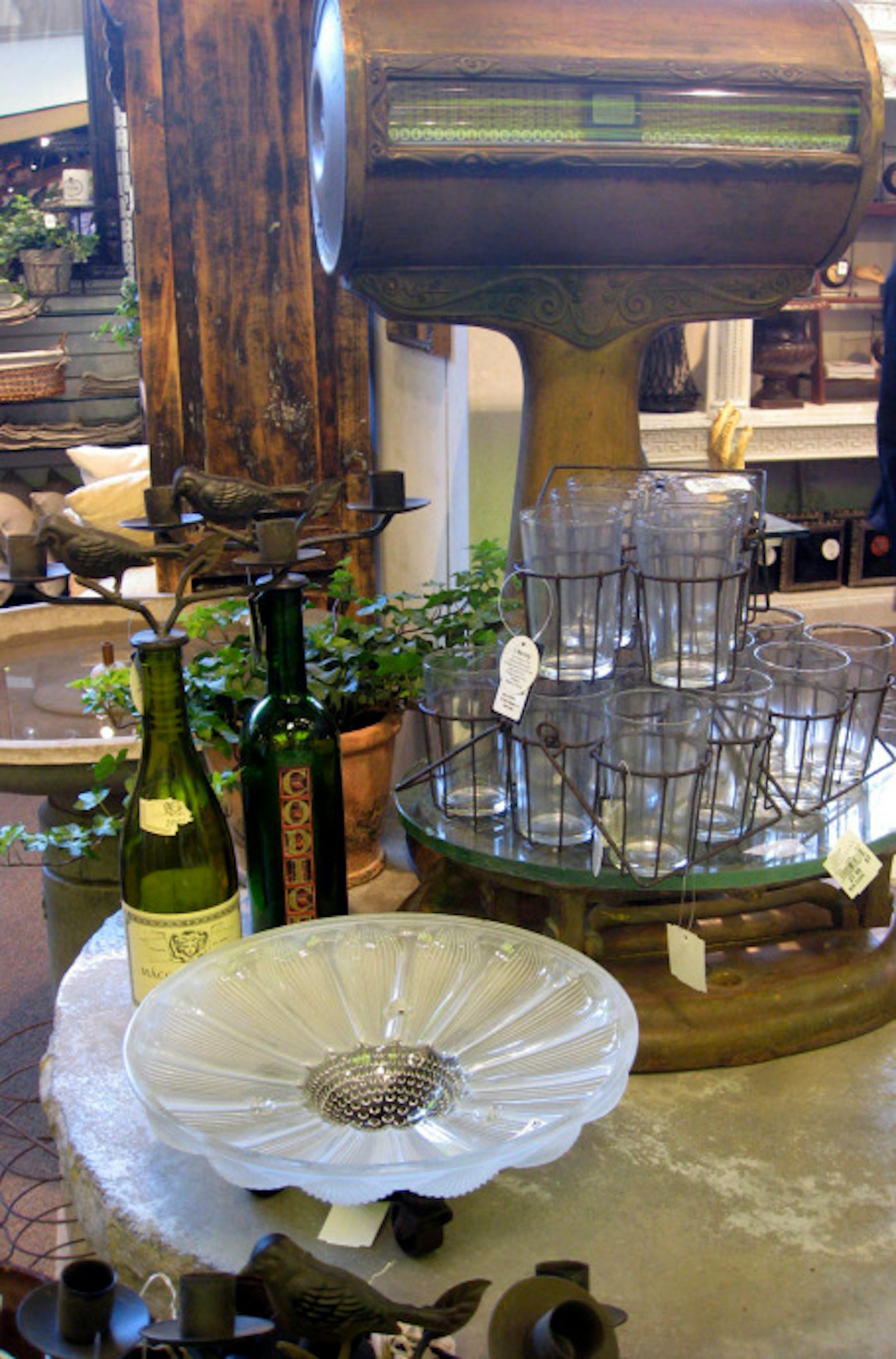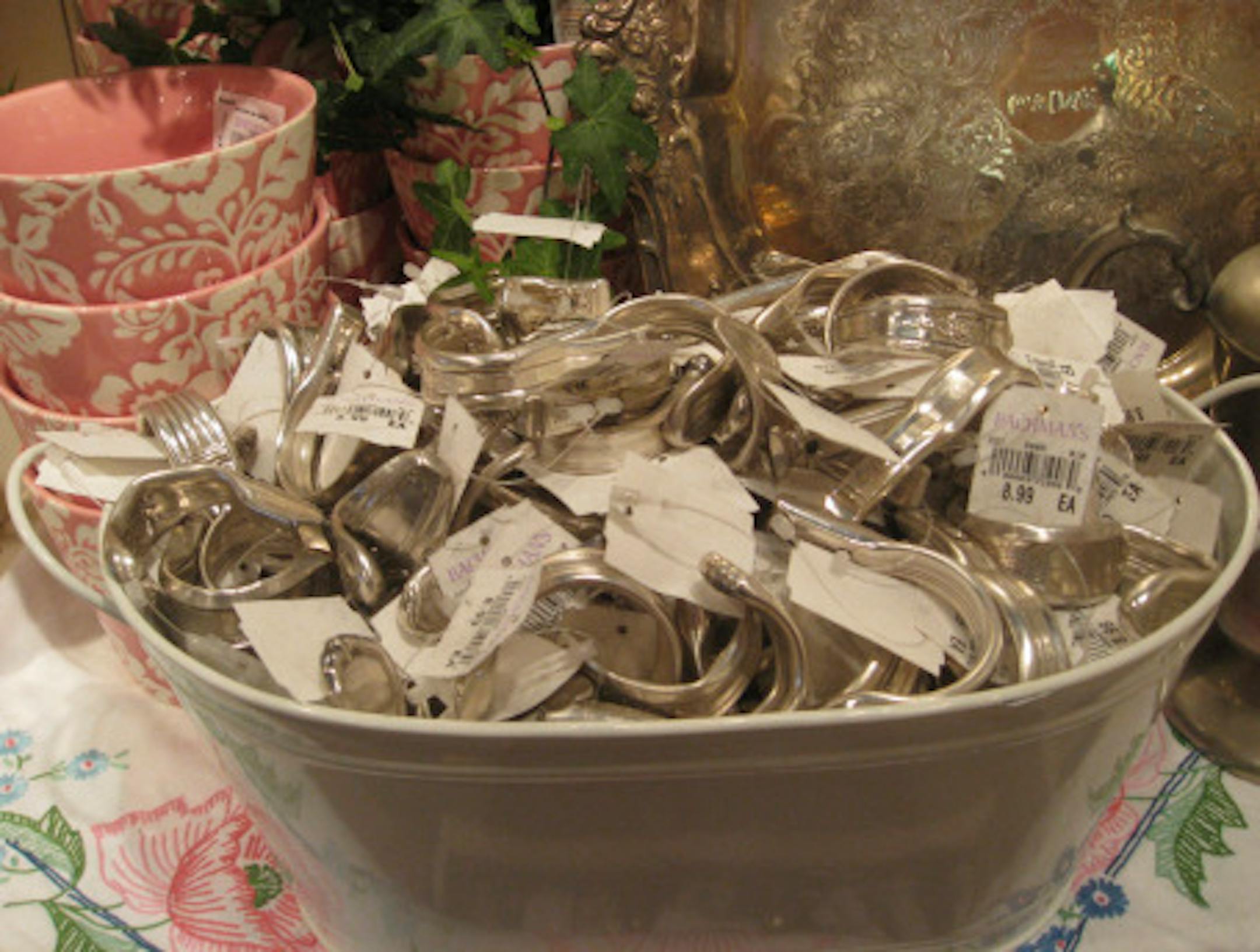 New items ordered at gift shows or replicated by regional artisans mingle with stuff that was salvaged rom scavenging trips from Dallas to Michigan as well as closer to home. Some items are repurposed, such as these hooks for hanging made from old silverware.