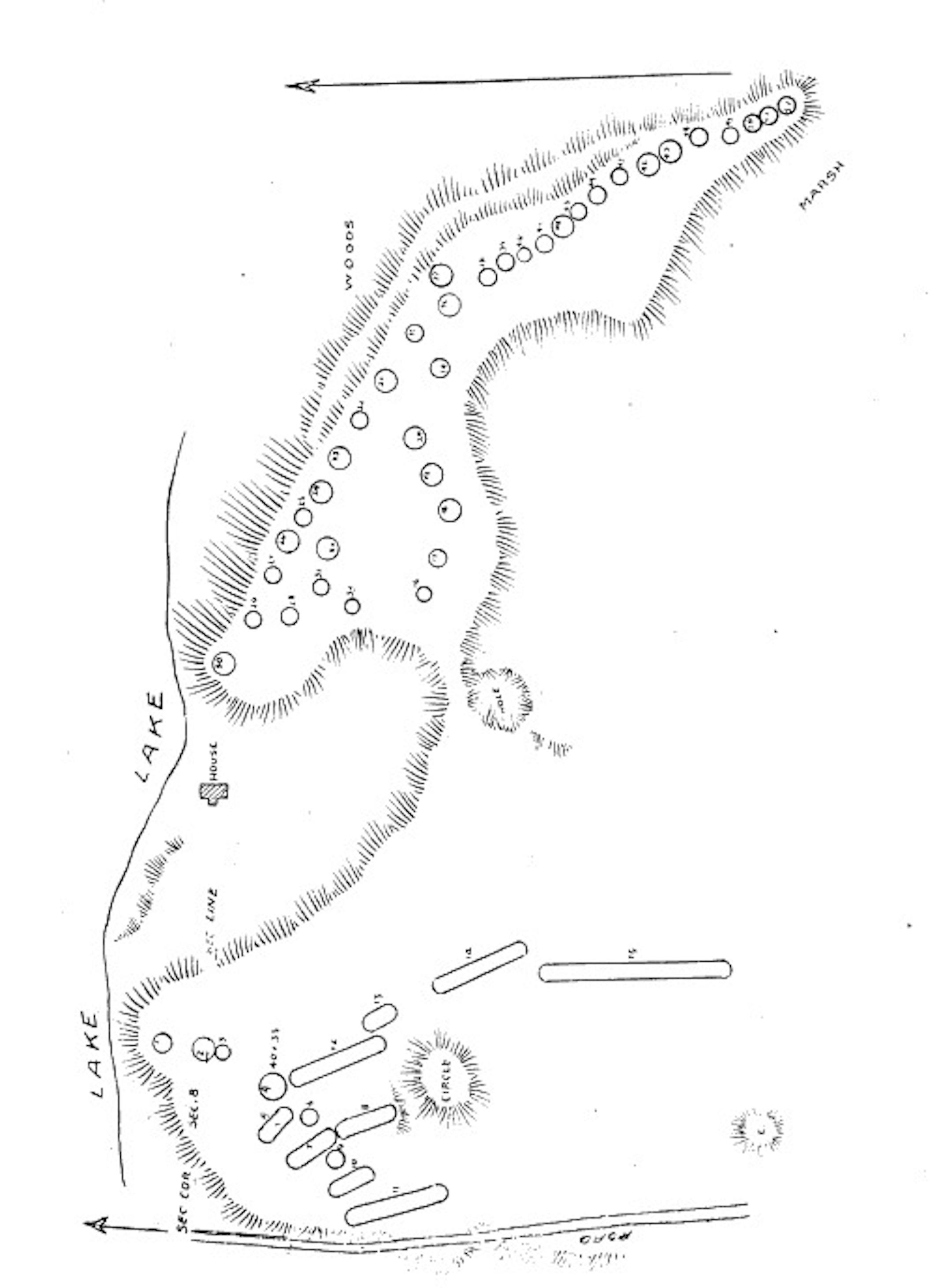 My Sunday column described the disturbance of an Indian mound at the east end of Lake Minnetonka, despite the area having been mapped as an archaeological site as early as 1883. Below is a map of the so-called Shaver Mounds included in a 1911 book, the Aborigines of Minnesota, digitized in Google Books and, as a pre-1922 work, in the public domain. Virtually all of the marked features in this map have been destroyed over the years.