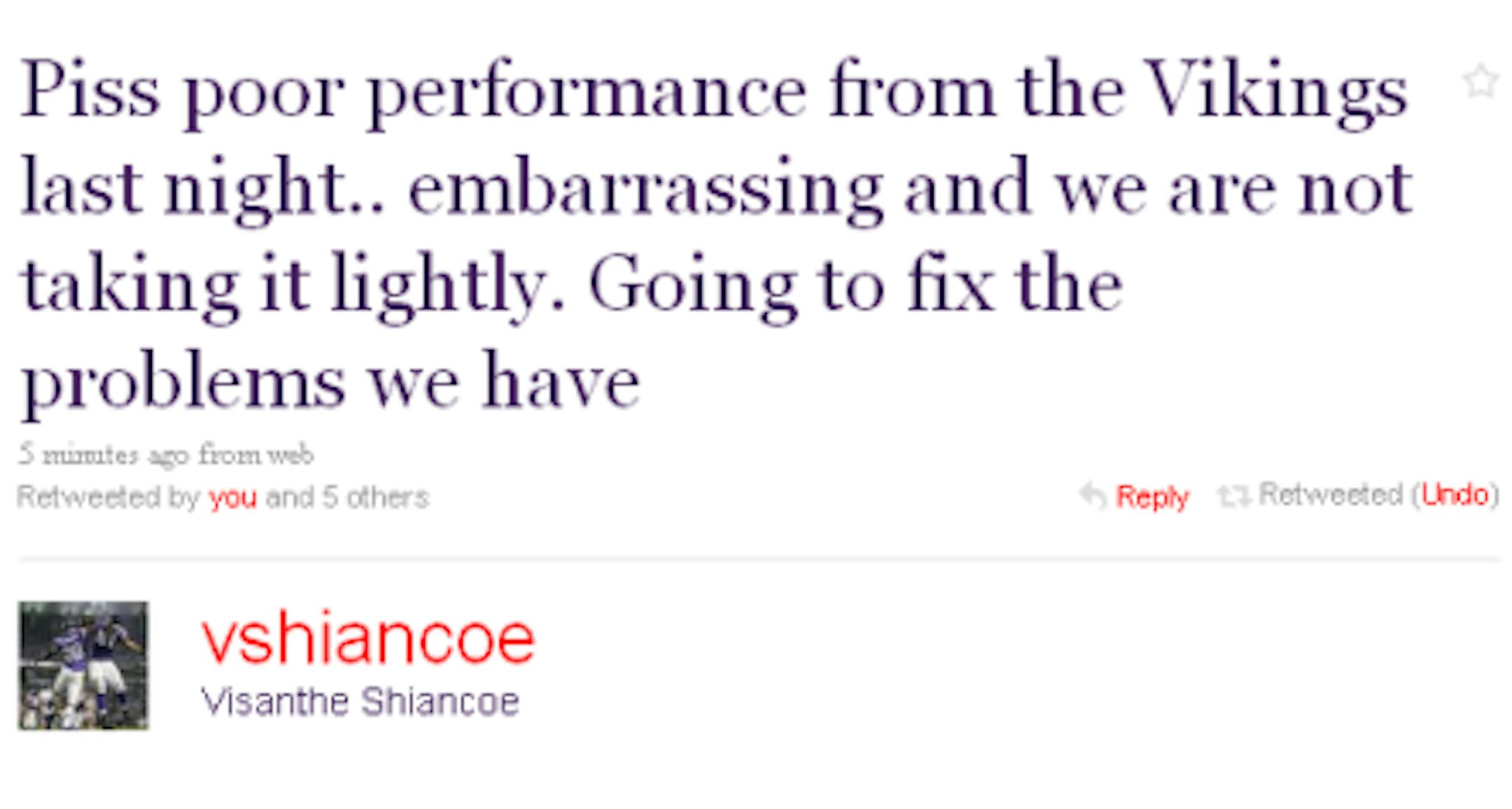 Vikings tight end Visanthe Shiancoe is always a good person to follow on Twitter. And just a few minutes ago, he let fly with a perfectly honest assessment of the way things went down last night in Carolina.