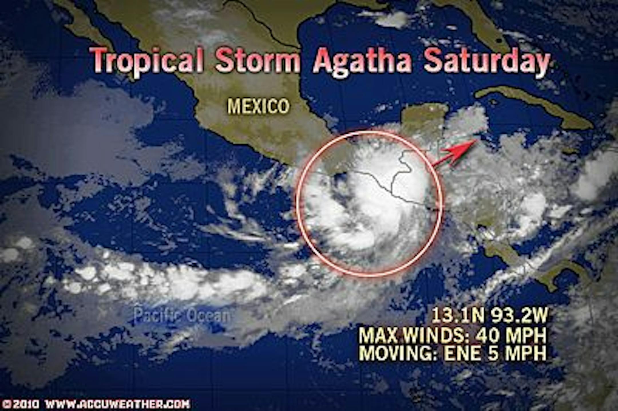 The system strengthened at midday and is now Tropical Storm Agatha in theEastern Pacific Basin.