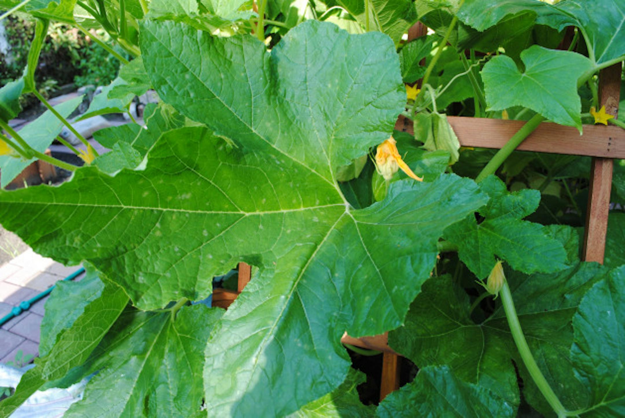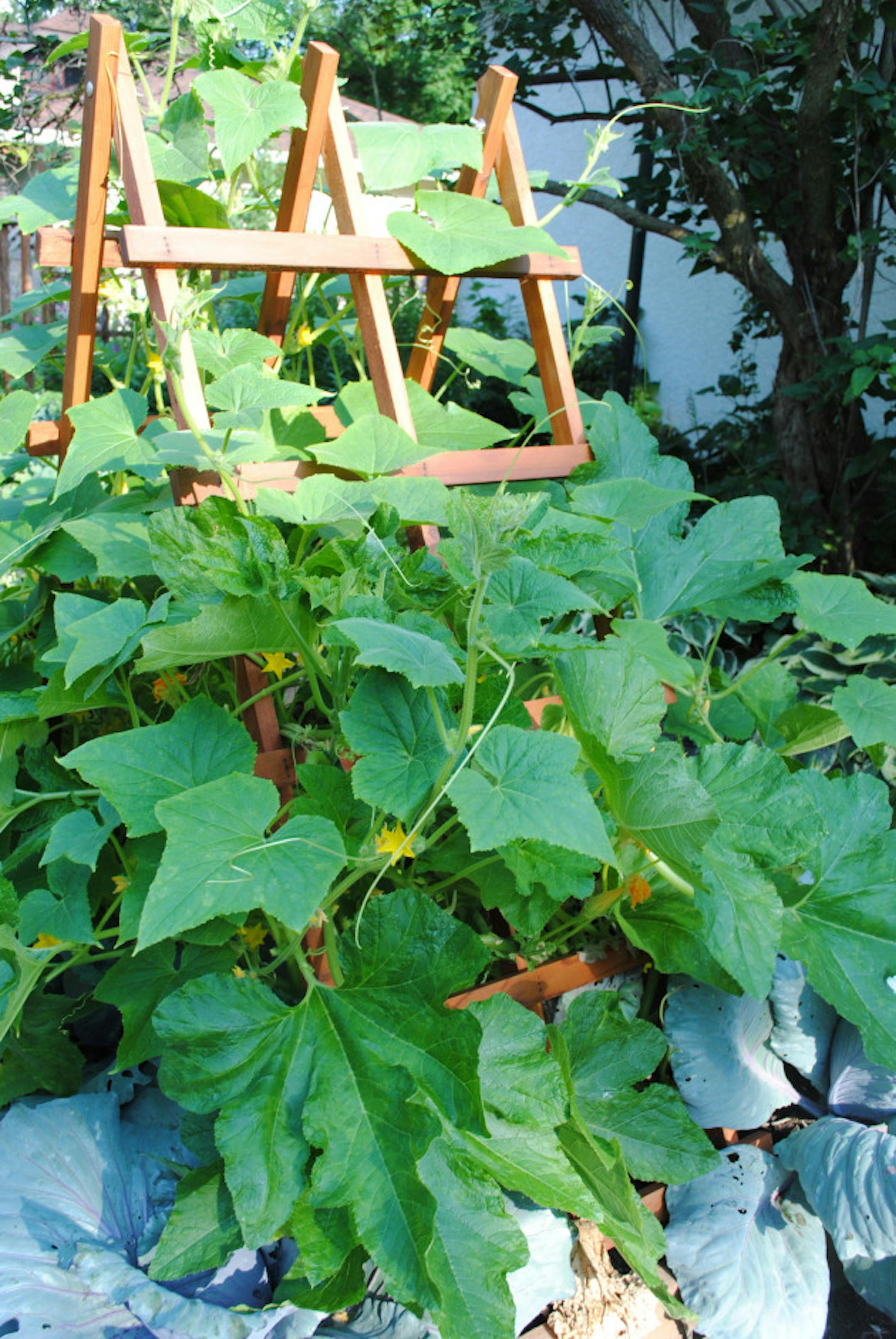 When I came up for air, I had time to realize that the vine growing up the other side of the A-frame trellis was no lemon cucumber. It had completely different, much larger leaves, and squash-type blossoms rather than small blooms.