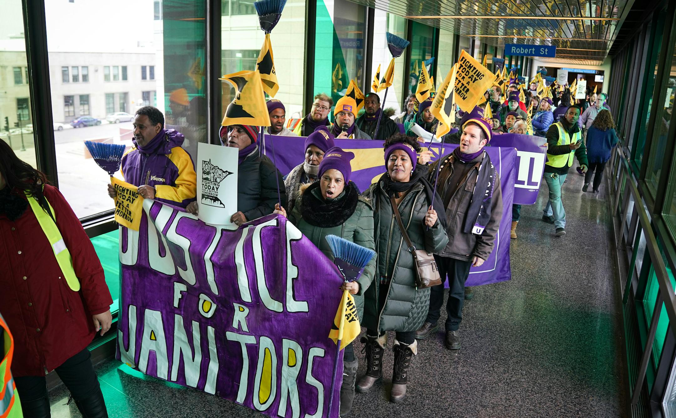 SEIU workers marched through the skyways of St Paul in 2019 to highlight the issue of wage theft. (Glen Stubbe, Star Tribune/The Minnesota Star Tribune)