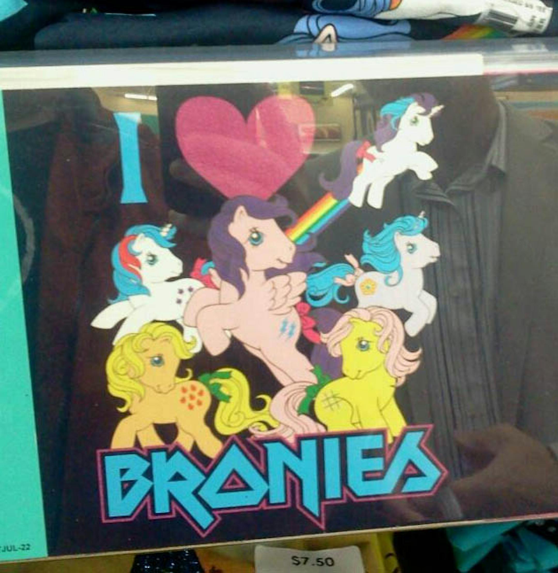 It's been reported in several venues that Wal-Mart is seling T-shirts aimed at that rich, broad demographic known as Bronies, Equestria Daily notes that they didn't quite get it right: