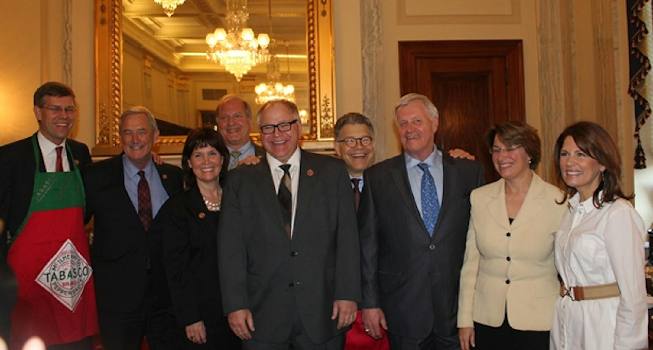 Pass the bicarb: It was bipartisan cookoff time in Washington, D.C., today, when Sen. Al Franken hosted fellow Minnesotans Sen. Amy Klobuchar and representatives Collin Peterson, Betty McCollum, Michele Bachmann, Keith Ellison, Tim Walz, Rick Nolan and Erik Paulsen for his third-annual "Hotdish- Off" (photo provided by Sen. Franken's office).