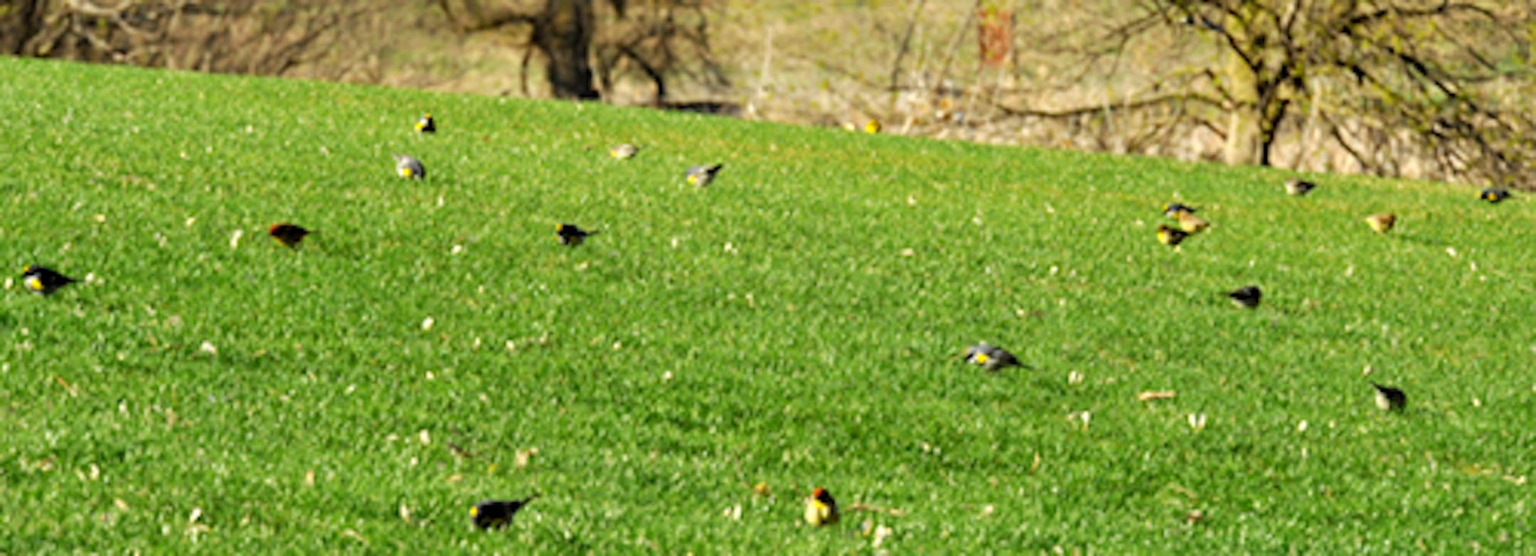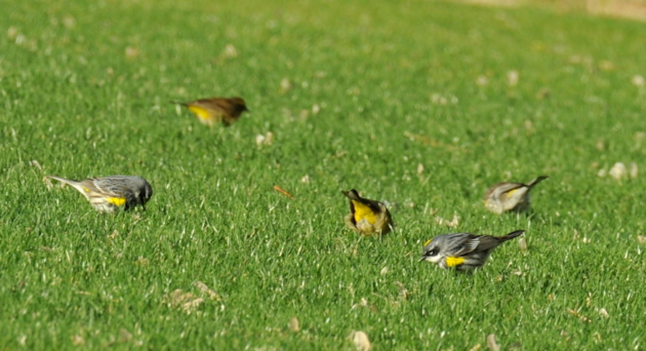 From one observation point on a short nine-hole golf course this morning (Friday) I counted 120 warblers. Moving twice to get views around and over nearby small hills, trying to avoid counting any bird twice, I add 74 more birds. They were foraging in the fairway grass. I am certain I didn't count them all. The birds were spread over approximately four acres. Most were Yellow-rumped. There were about 40 Palm Warblers, and two Yellow Warblers. I could find no other species. Unfortunately, the golf course is private, access limited. I was there because I tend the nest boxes on the course. A fallout, should you not know, is a concentration of birds observed while taking a break from migration. They could be feeding and resting or be grounded by bad weather. The photos are lousy, but offer an idea of the concentration of some of these birds. There are 20 birds in the first photo.
