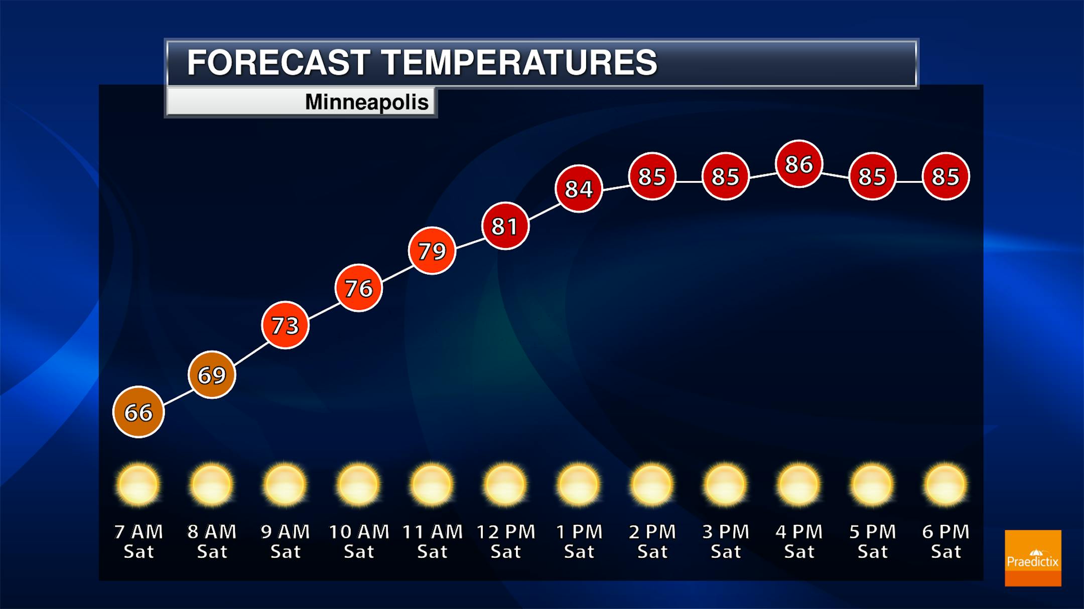 A sunny start to the weekend is expected in the Twin Cities Saturday, though you should expect a hazy look to the sky as we will still feature wildfire smoke across the region. Morning lows bottom out in the 60s before highs climb to the mid-80s in the late afternoon hours.