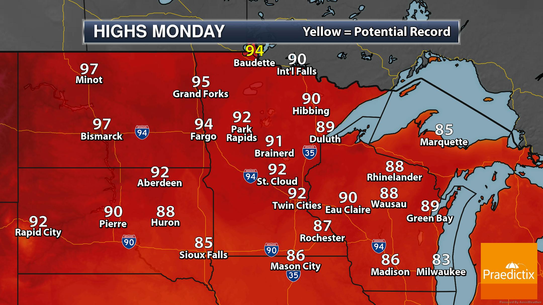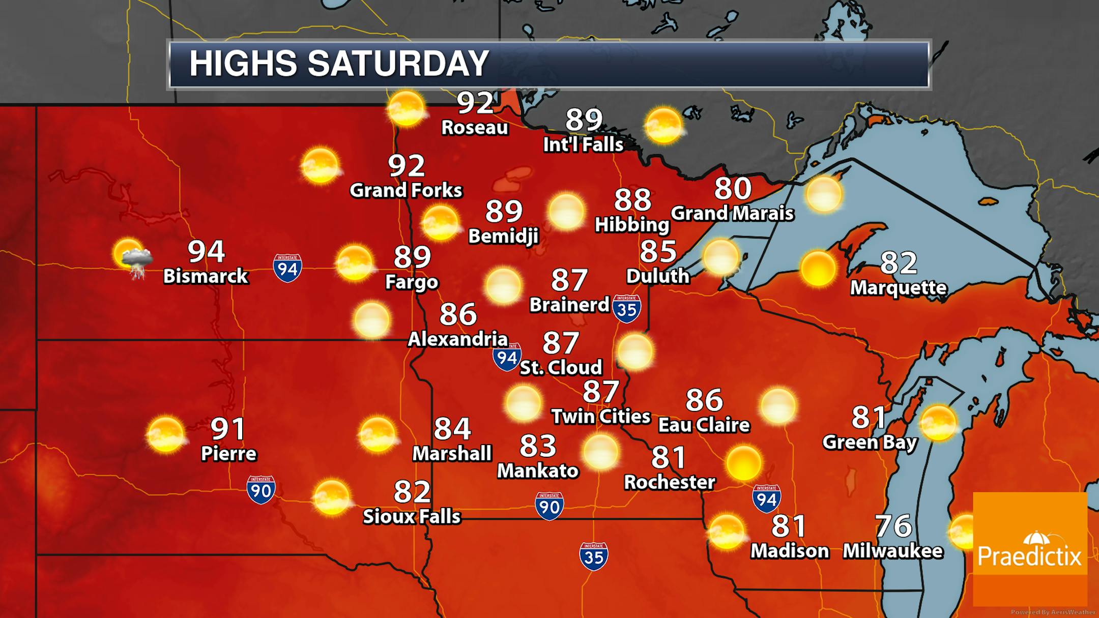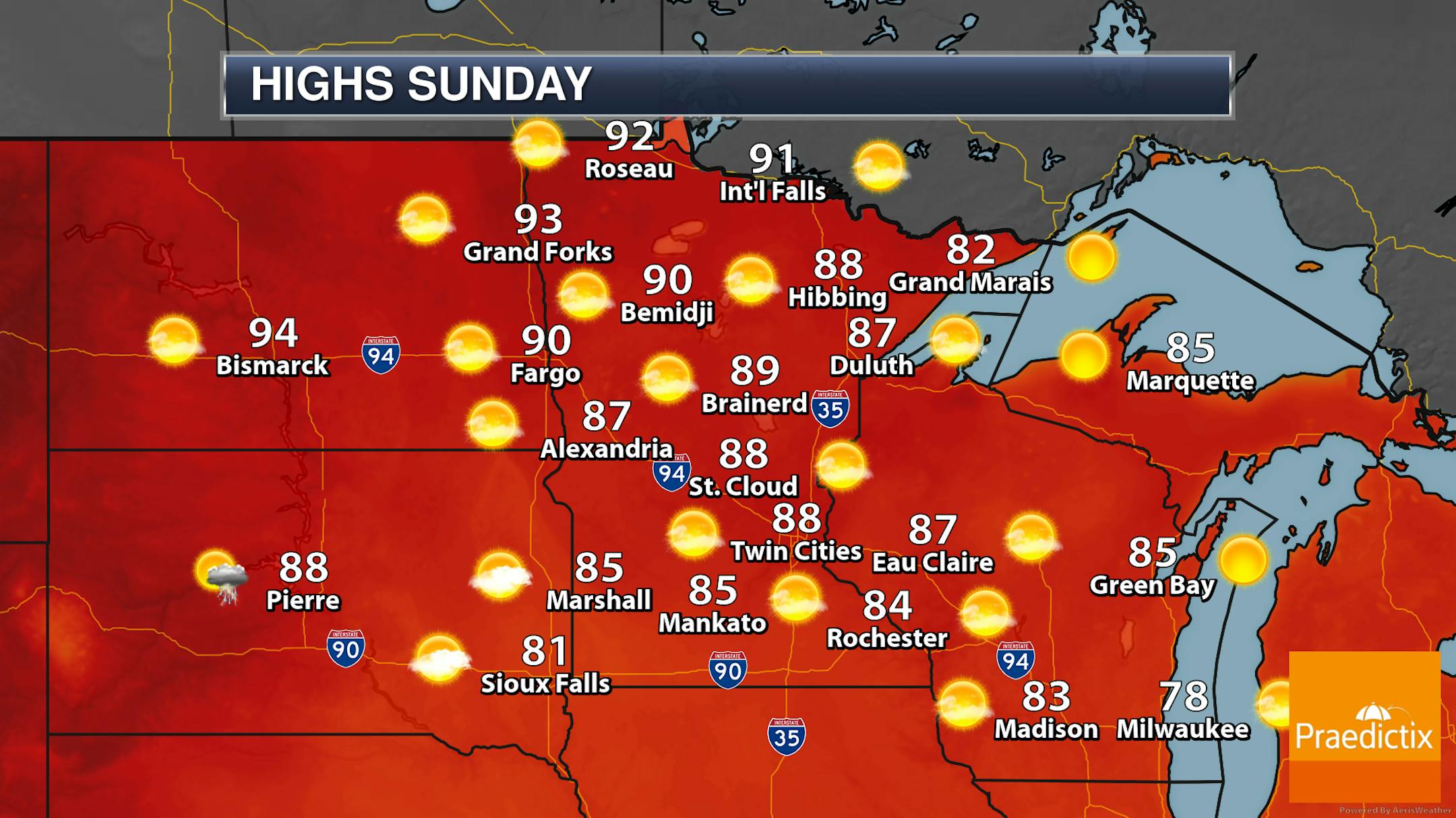 Not much change on Sunday across the region, though it will be a few degrees warmer under mainly sunny skies. The warmest temperatures will be in portions of northern Minnesota, where locations like International Falls, Bemidji, and Roseau could top off in the 90s.