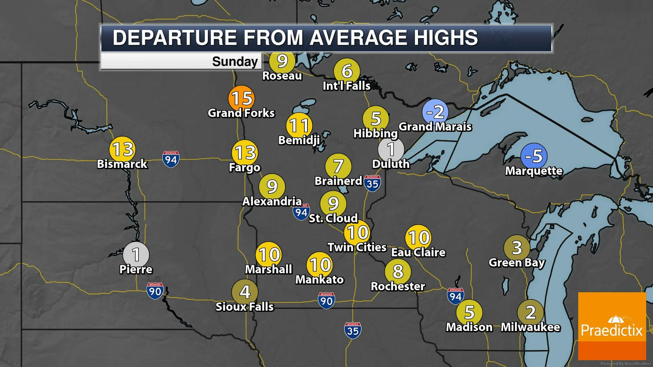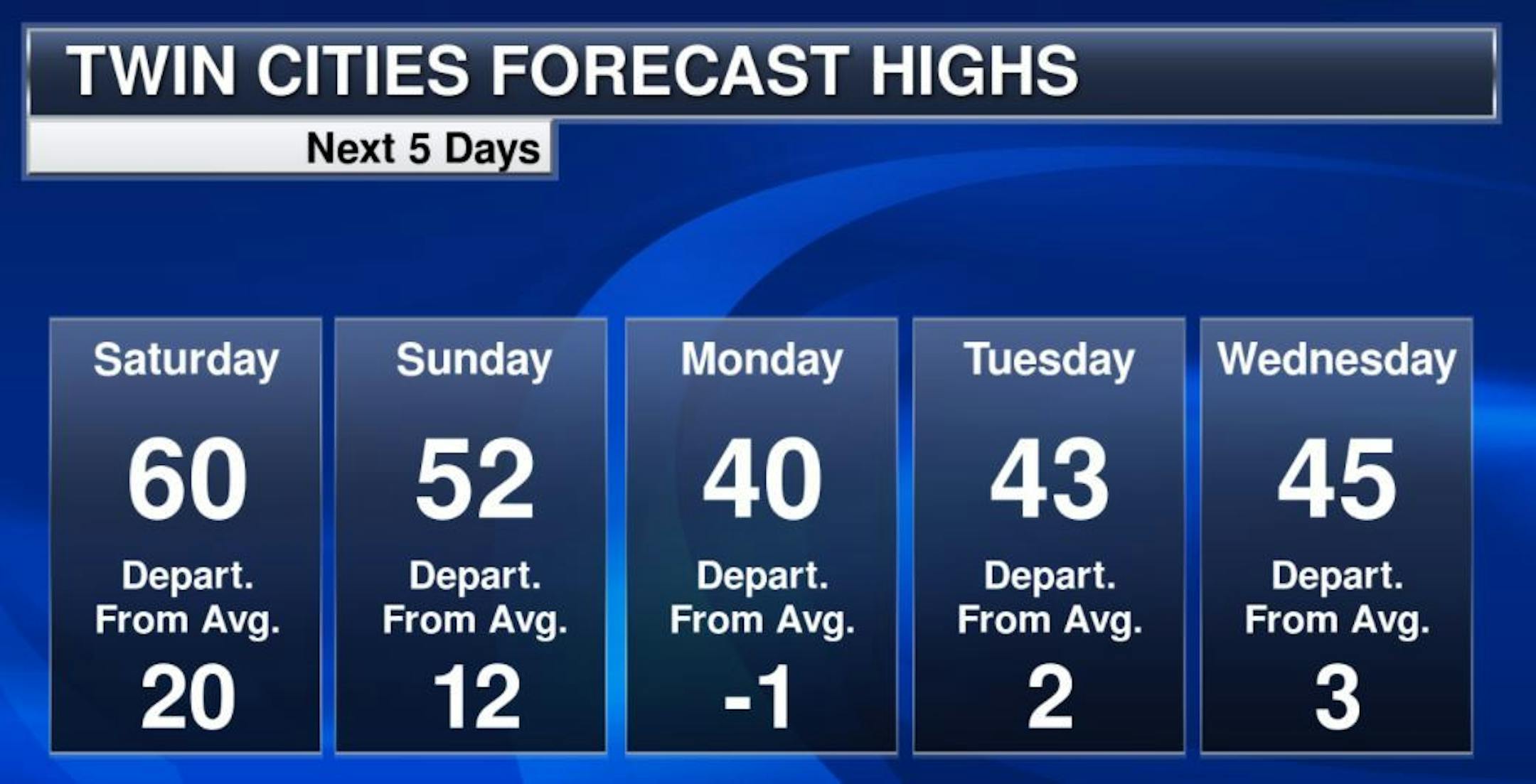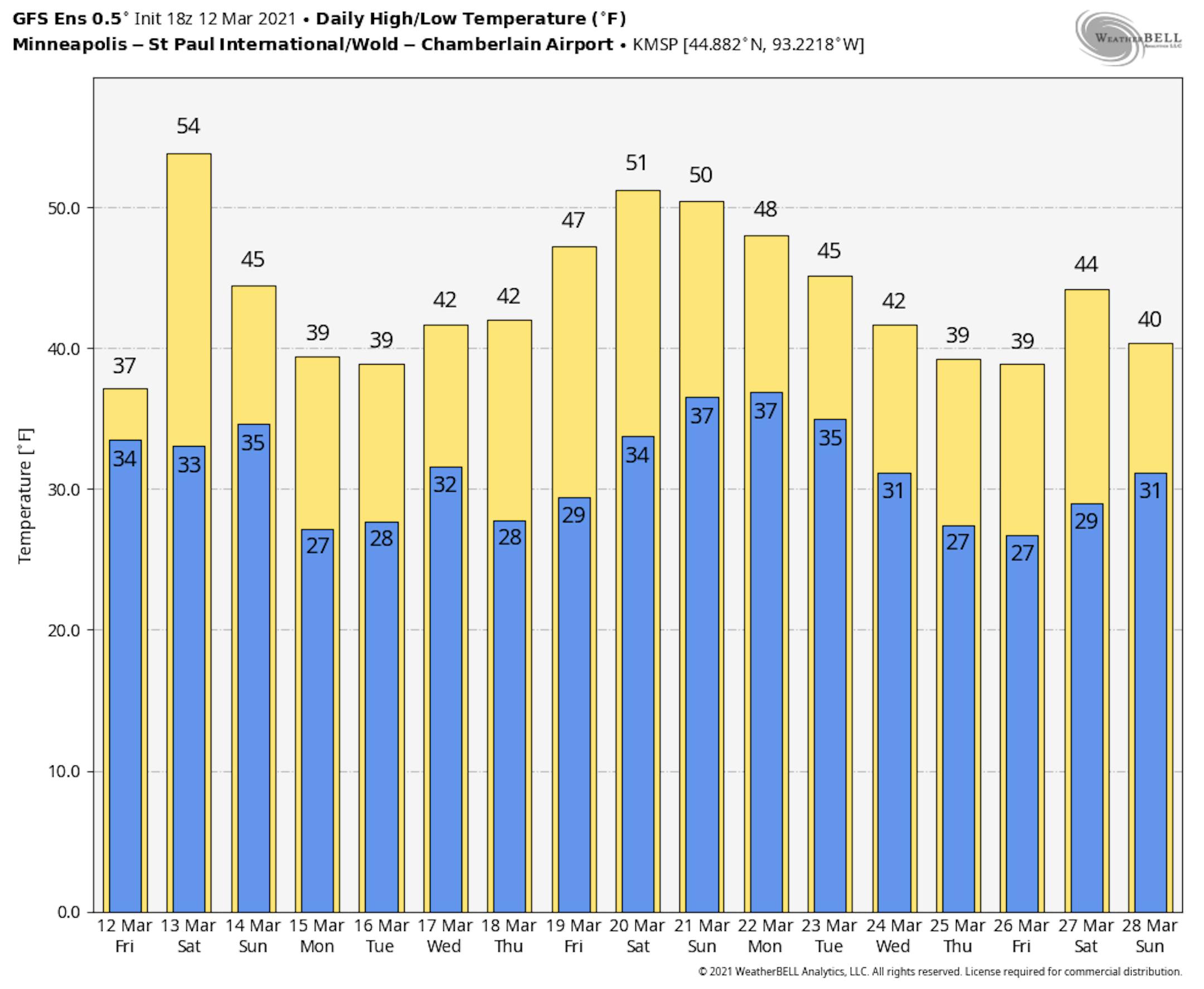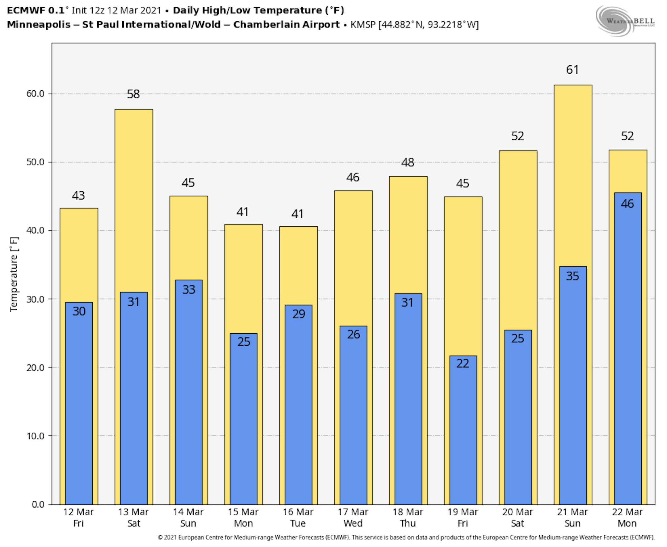 The weekend ahead looks pretty mild for mid March. Temps on Saturday will be nearly 20F warmer than average in the Twin Cities with readings dropping nearly 10F on Sunday as a storm system moves in.