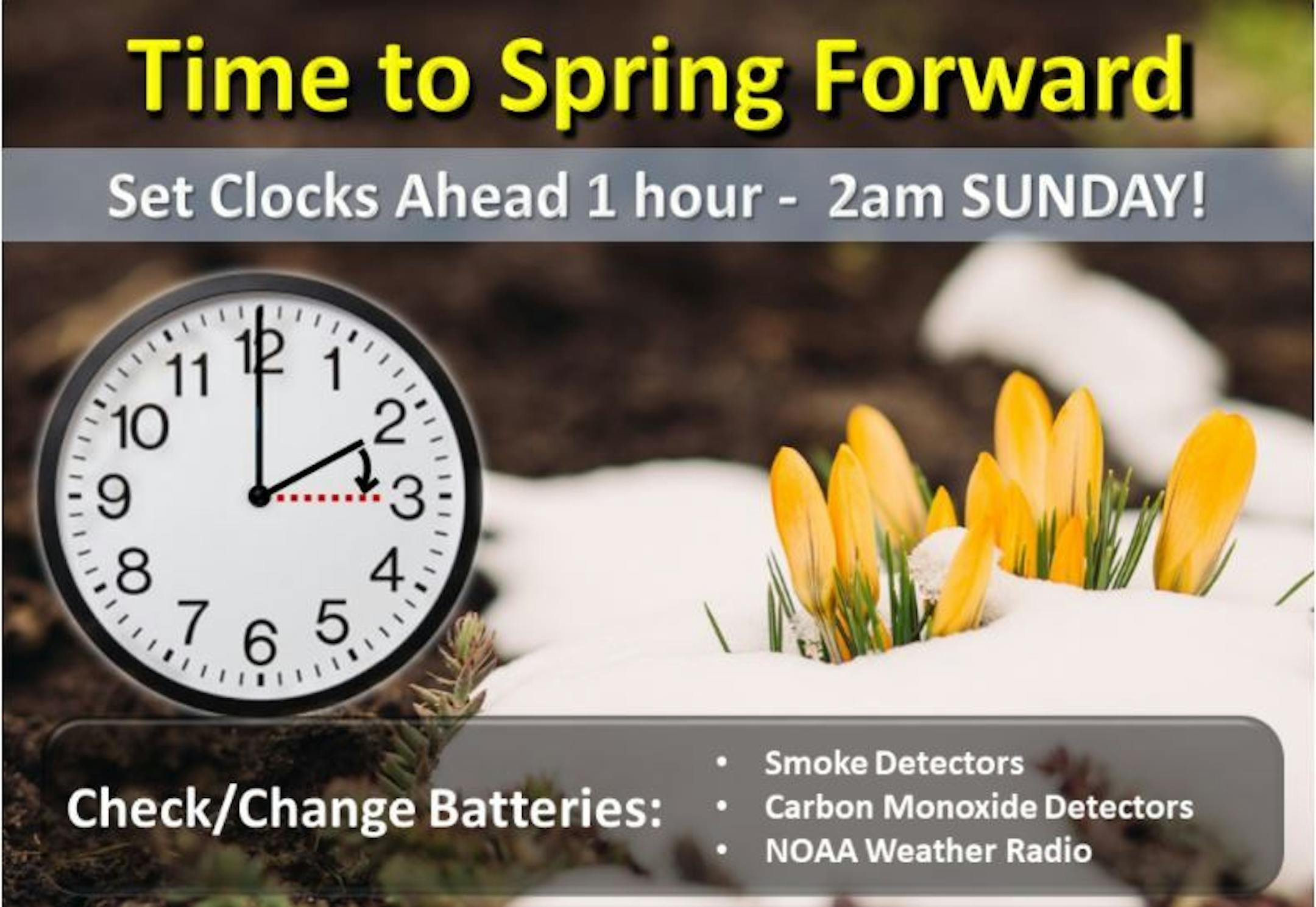 Don't forget to set your clocks ahead 1 hour before heading to bed on Sunday. We SPRING forward 1 hour early Sunday morning, which means our sunset will be 1 hour later starting Sunday! Don't be late.