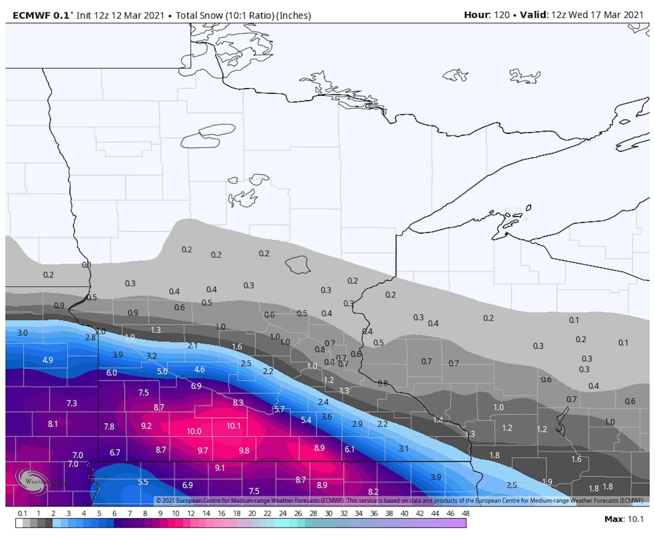 Here's the latest precipitation and snowfall potential through the weekend and into early next week, which shows up to 1" of total liquid falling across far southwest Minnesota. This pocket of heavy precipitation could also result in areas of heavy snowfall through early next week as well. Stay tuned.