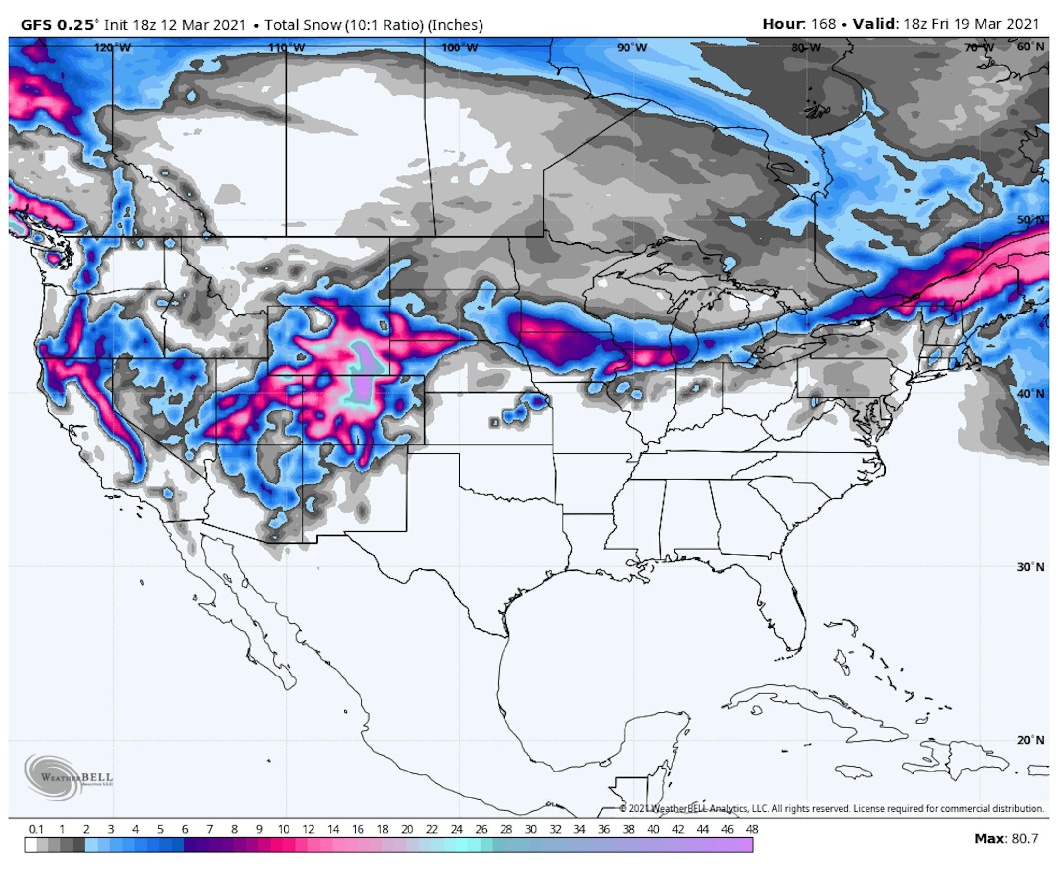 Weather conditions sour a bit on Sunday with clouds rolling in from the Southwest. Winds will also be a bit breezy as a storm system moves in with areas of rain changing to snow late in the day across the southwest. However, high temps will still be running nearly 10F above average for mid March.