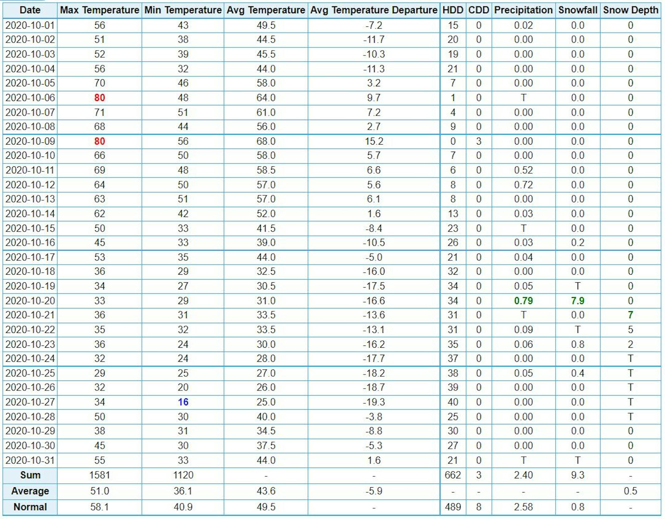 Here is a more comprehensive chart of daily weather data for October 2020. Note that highs reach 80F two times on the 6th and 9th, but fell into the 30s by the 18th. On the 20th, MSP picked up 7.9" of snow, another 0.8" on the 23rd and another 0.4" on the 25th for a grand total of 9.3" for the month! The coldest temp recorded was 16F on the 27th, which tied for the 8th coldest temp ever recorded during the month of October. The coldest temp was 10F set on October 30th, 1925.