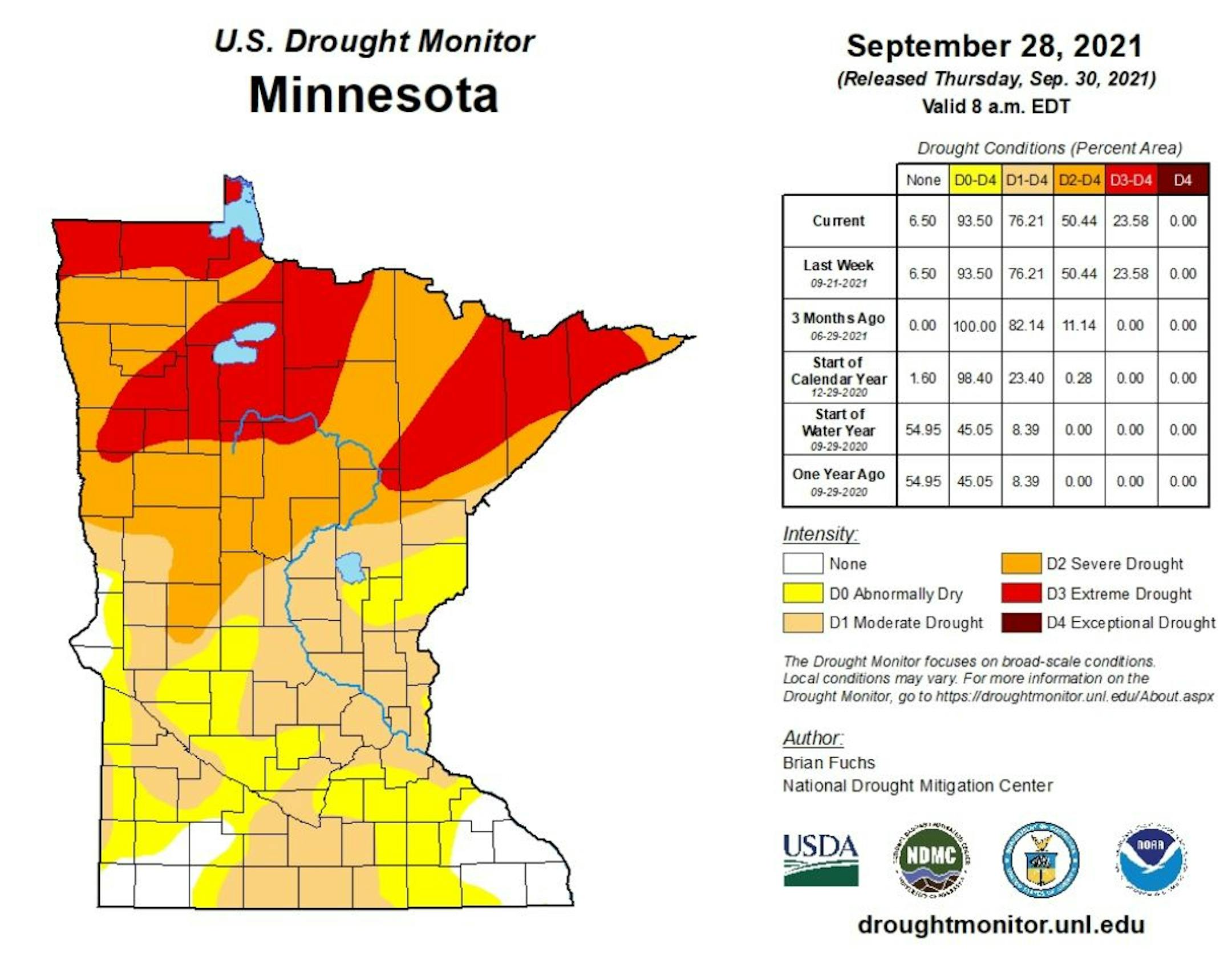 According to the US Drought Monitor, nearly 24% of the state is still considered to be in an extreme drought, those locations are located in the northern part of the state. Nearly 50% of the state is still under a severe drought (again, mainly up north) and about 76% percent of the state is in a moderate drought, which includes the Twin Cities.