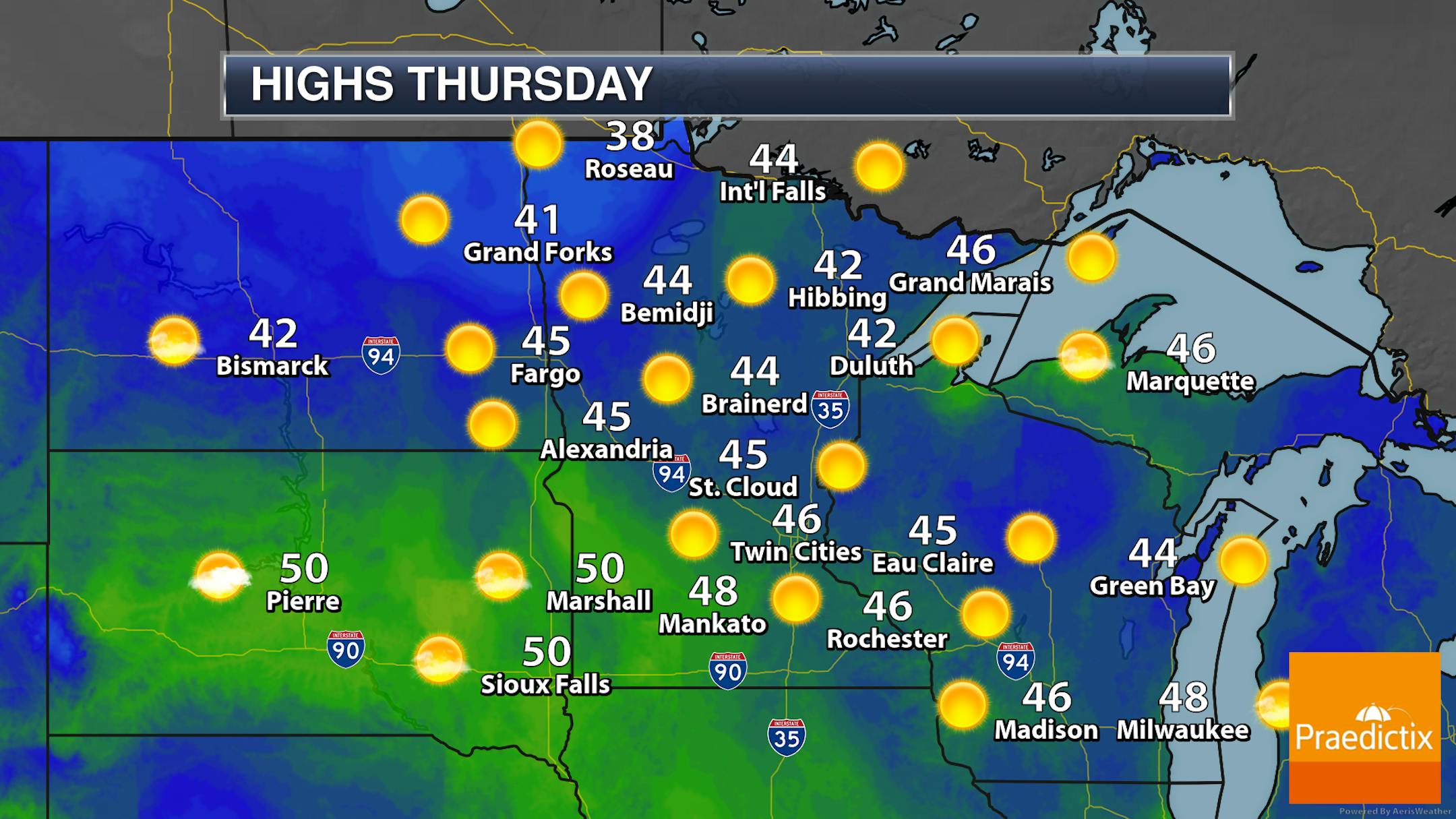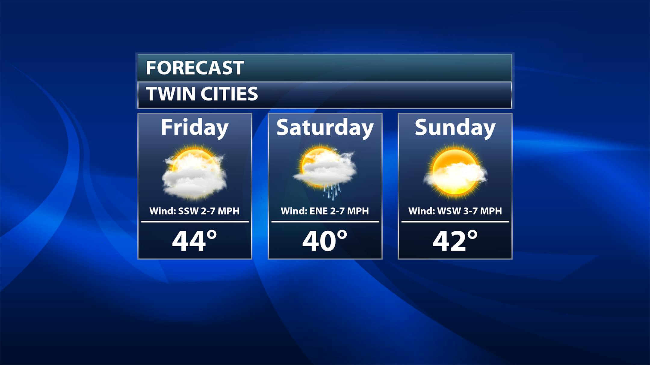 Friday: A mainly cloudy Friday is expected with the potential of a few rain showers working into the metro late in the day (more likely into the overnight hours). This system will bring a mix of precipitation across northern Minnesota. Highs in the metro will be in the mid-40s.