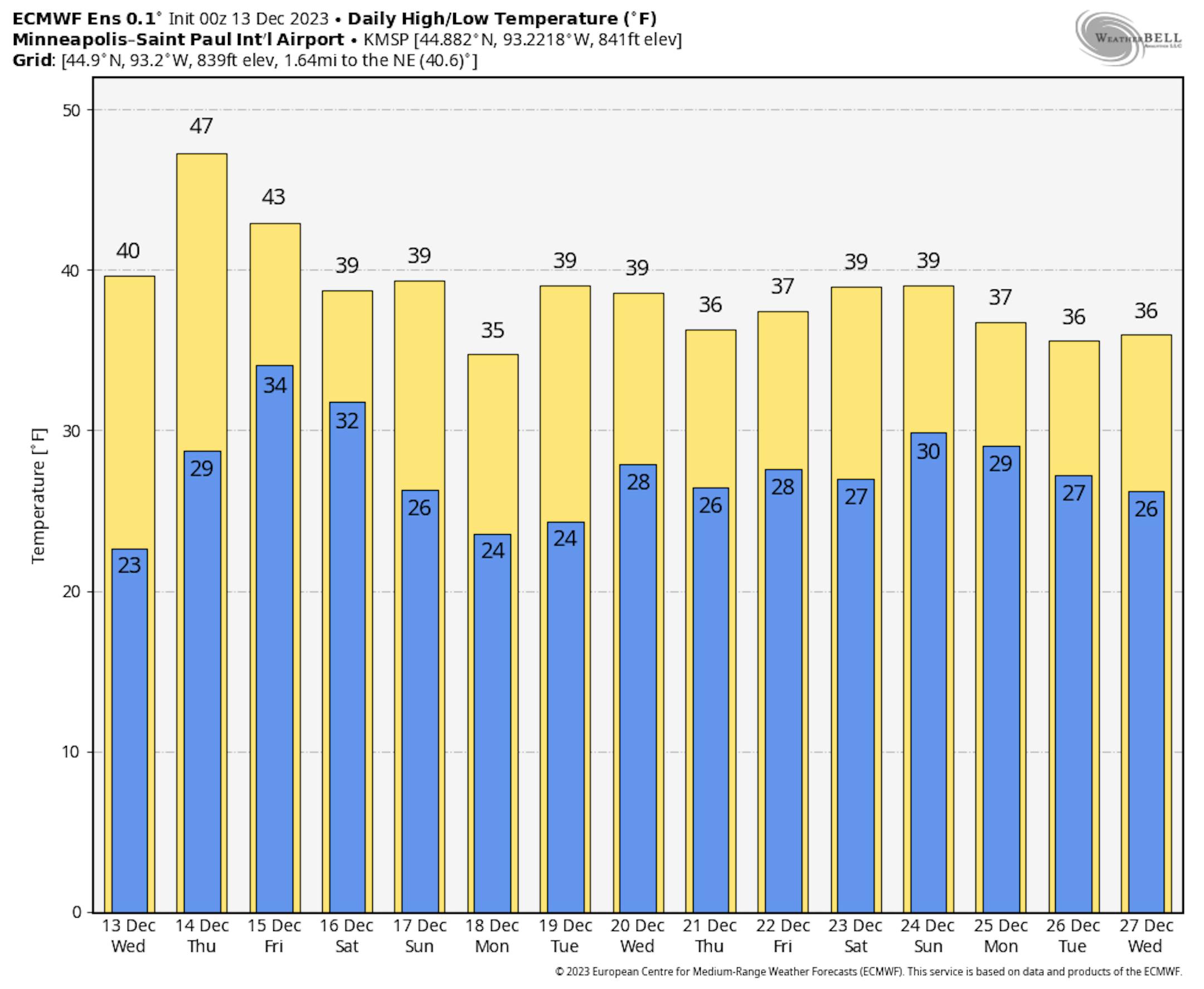 Quiet weather stretches across the state on Thursday, with highs in spots up to 25F degrees above average for mid-December. Highs range from the upper 30s near Roseau to the low 50s in southwestern Minnesota.