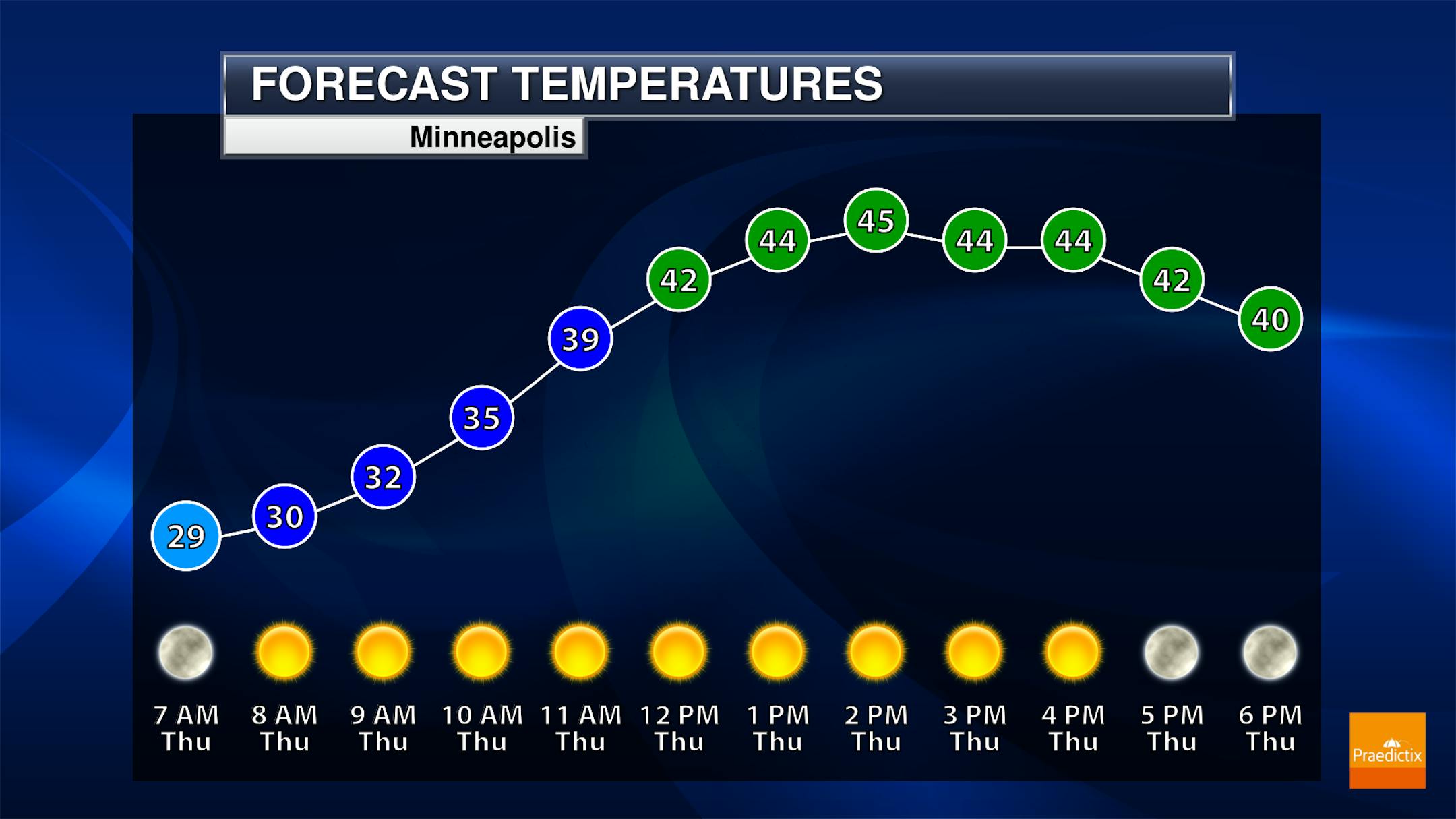 I'll take this quiet weather over a messy, snowy system this time of year! Highs will be 15-20F degrees above average in the metro on Thursday in the mid-40s under mainly sunny skies. That'll be after the day starts in the upper 20s.