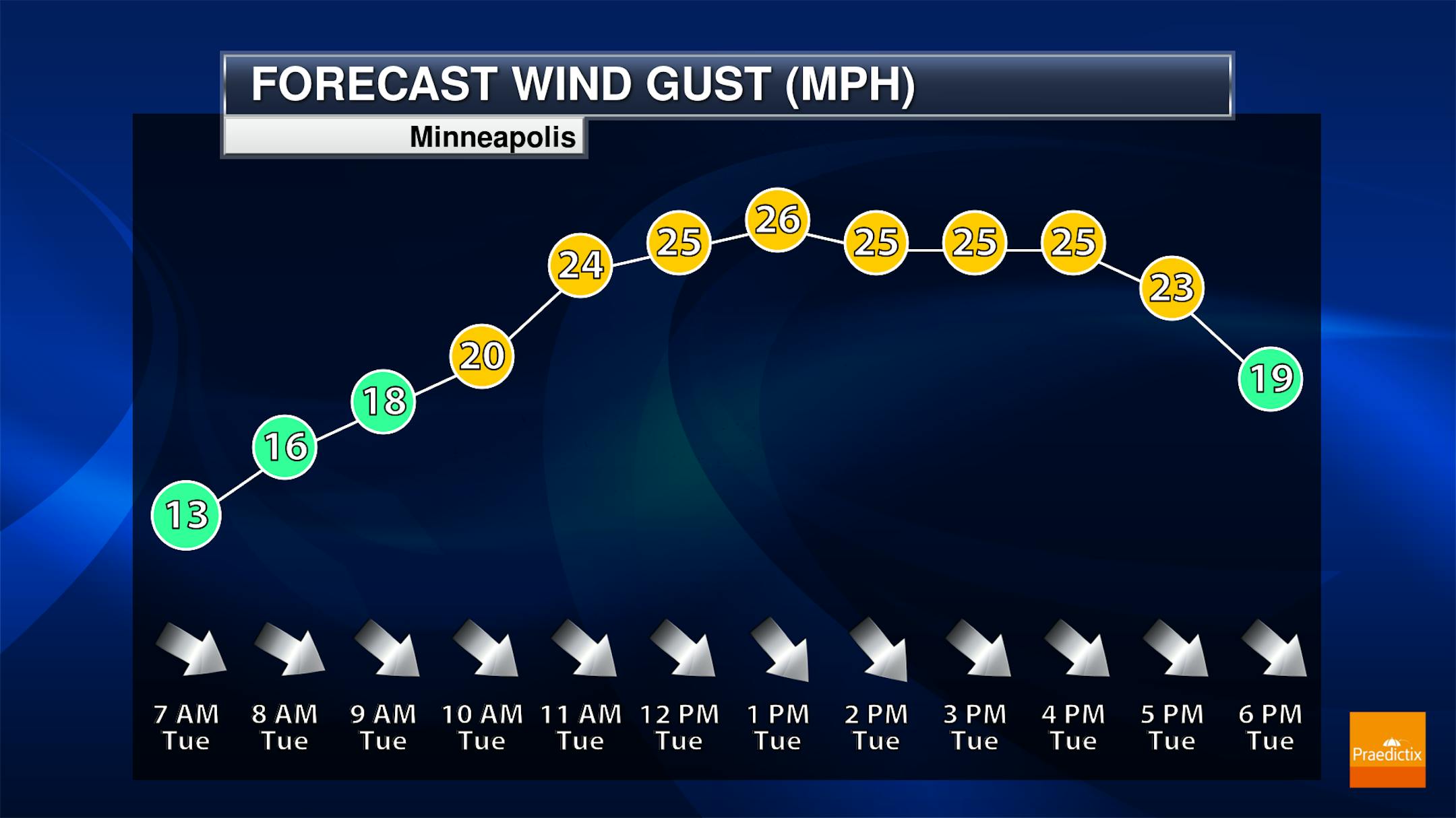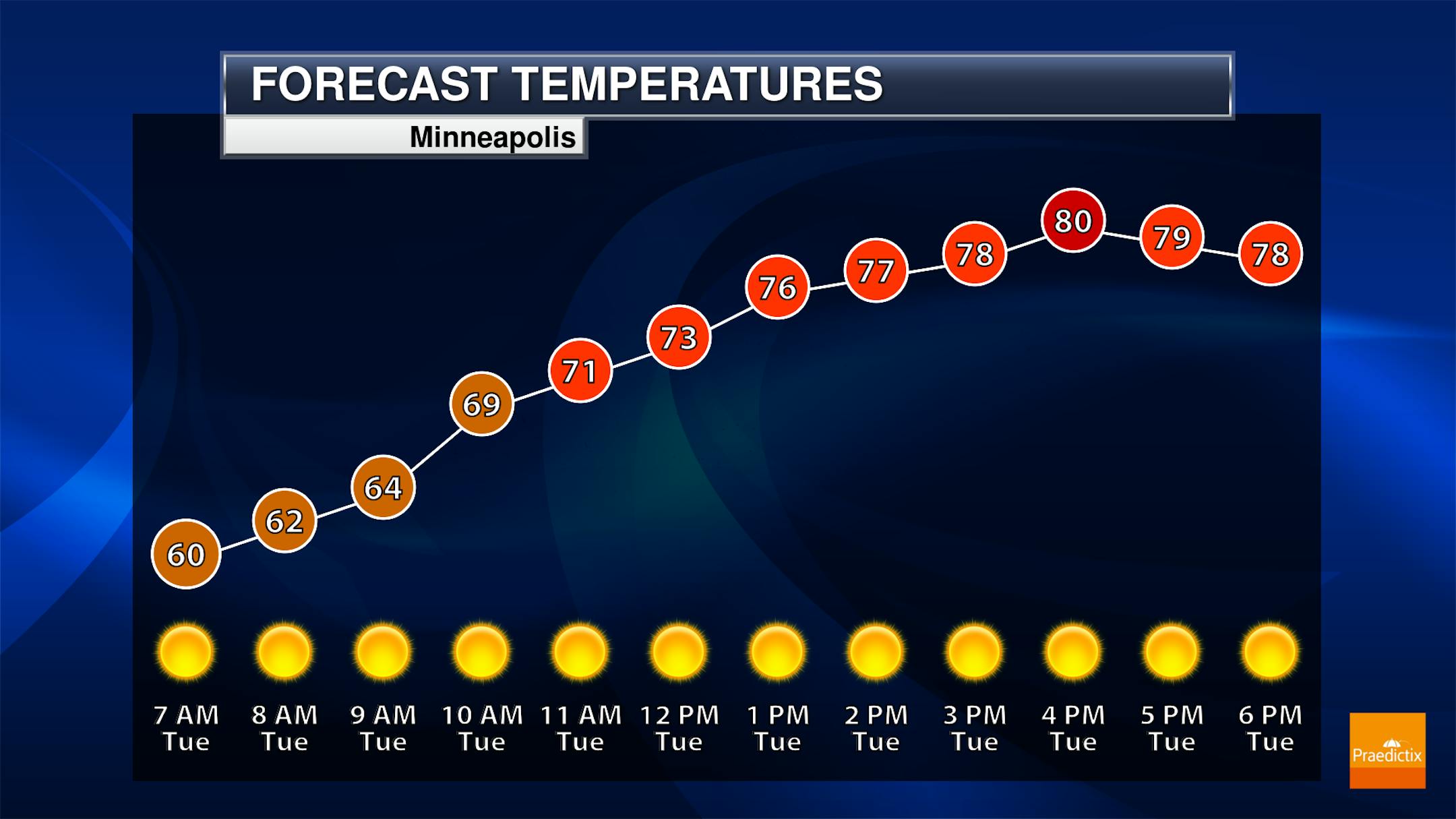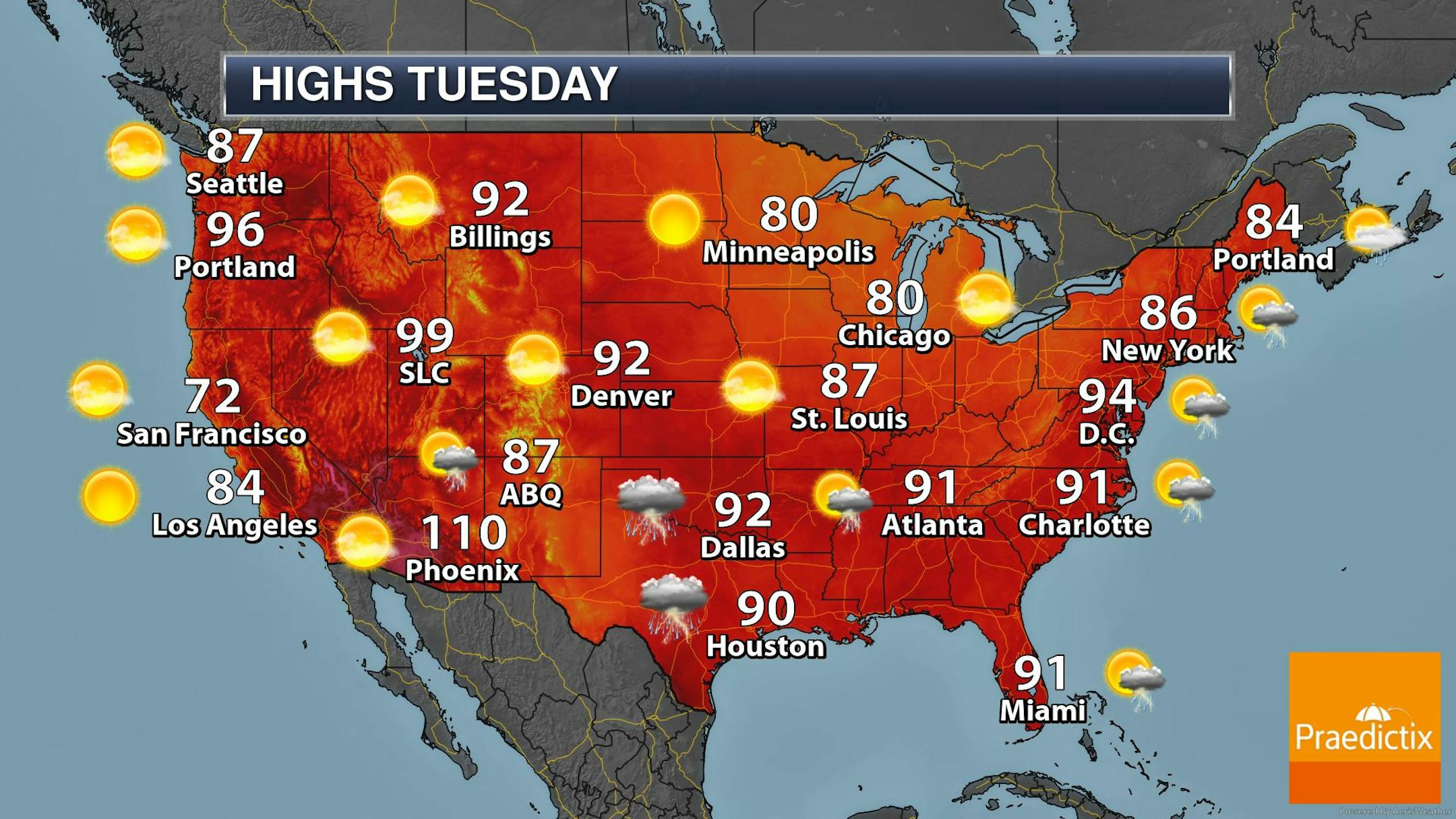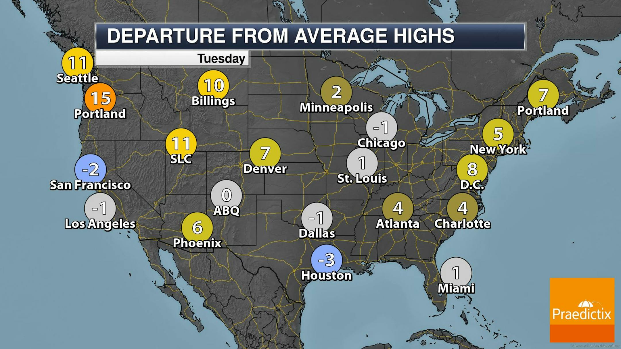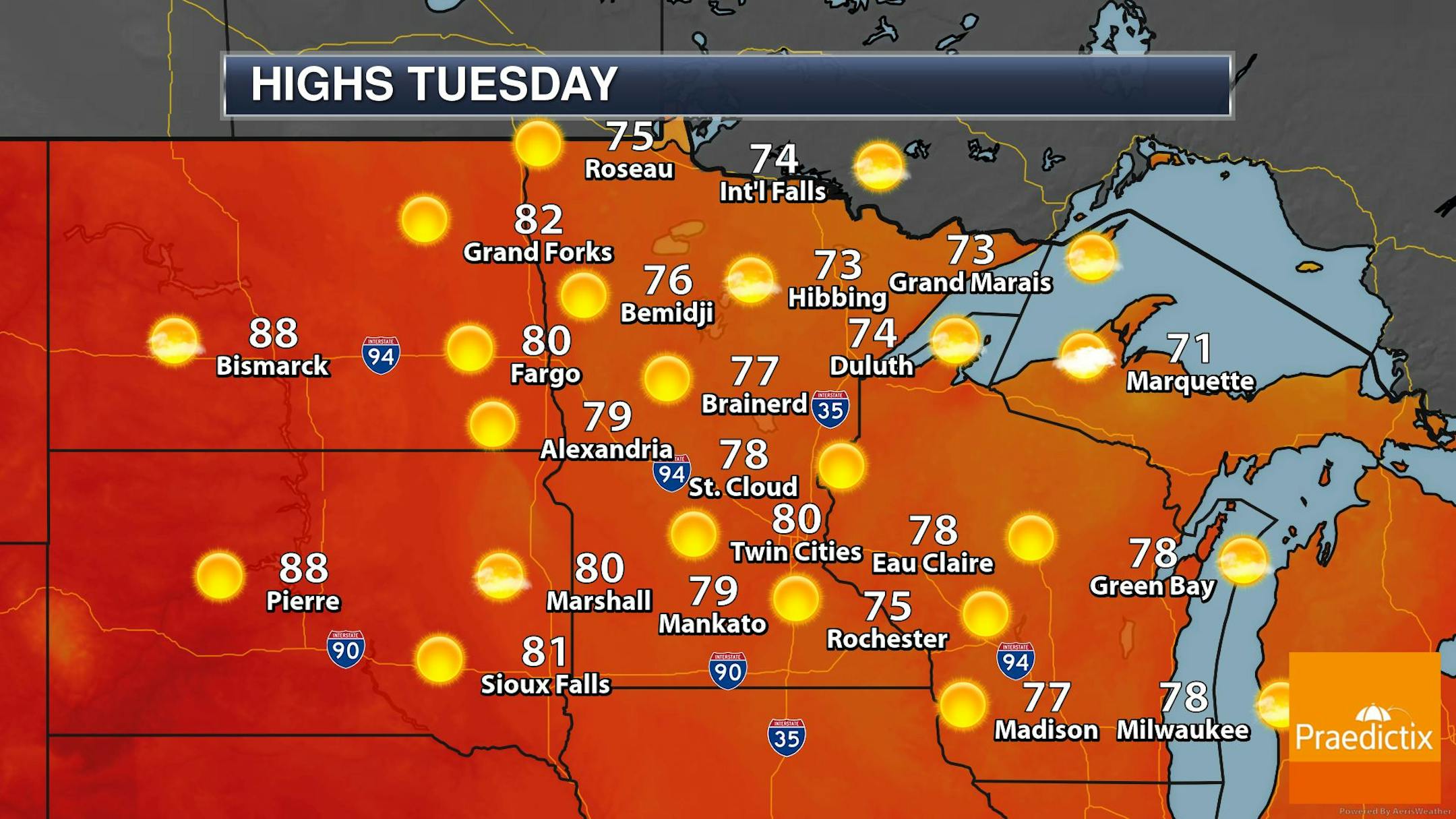 The weather outlook for Tuesday shows temps at or slightly above average across the region. Readings will warm into the 70s and 80s with bright sunshine and somewhat breezy winds.