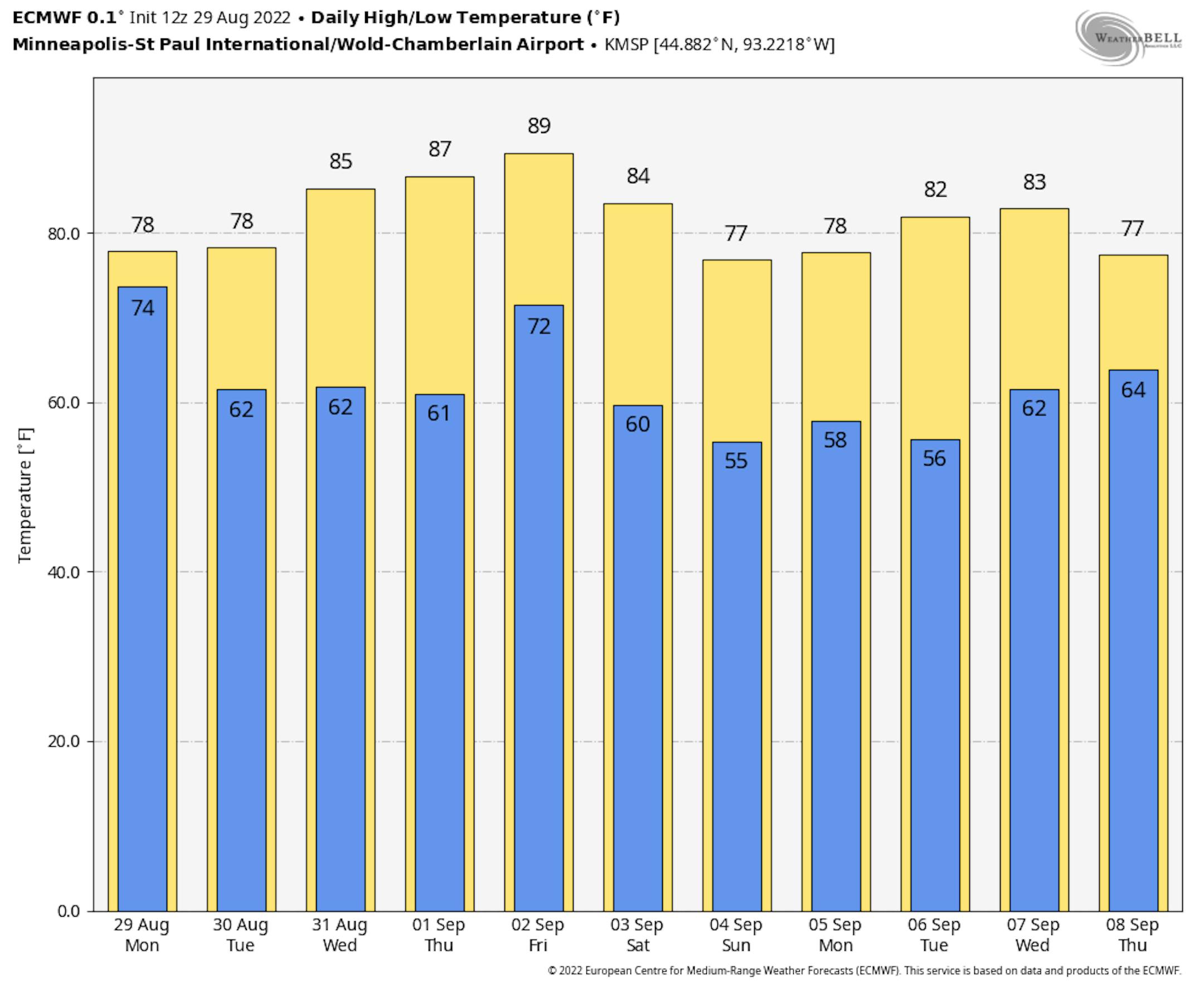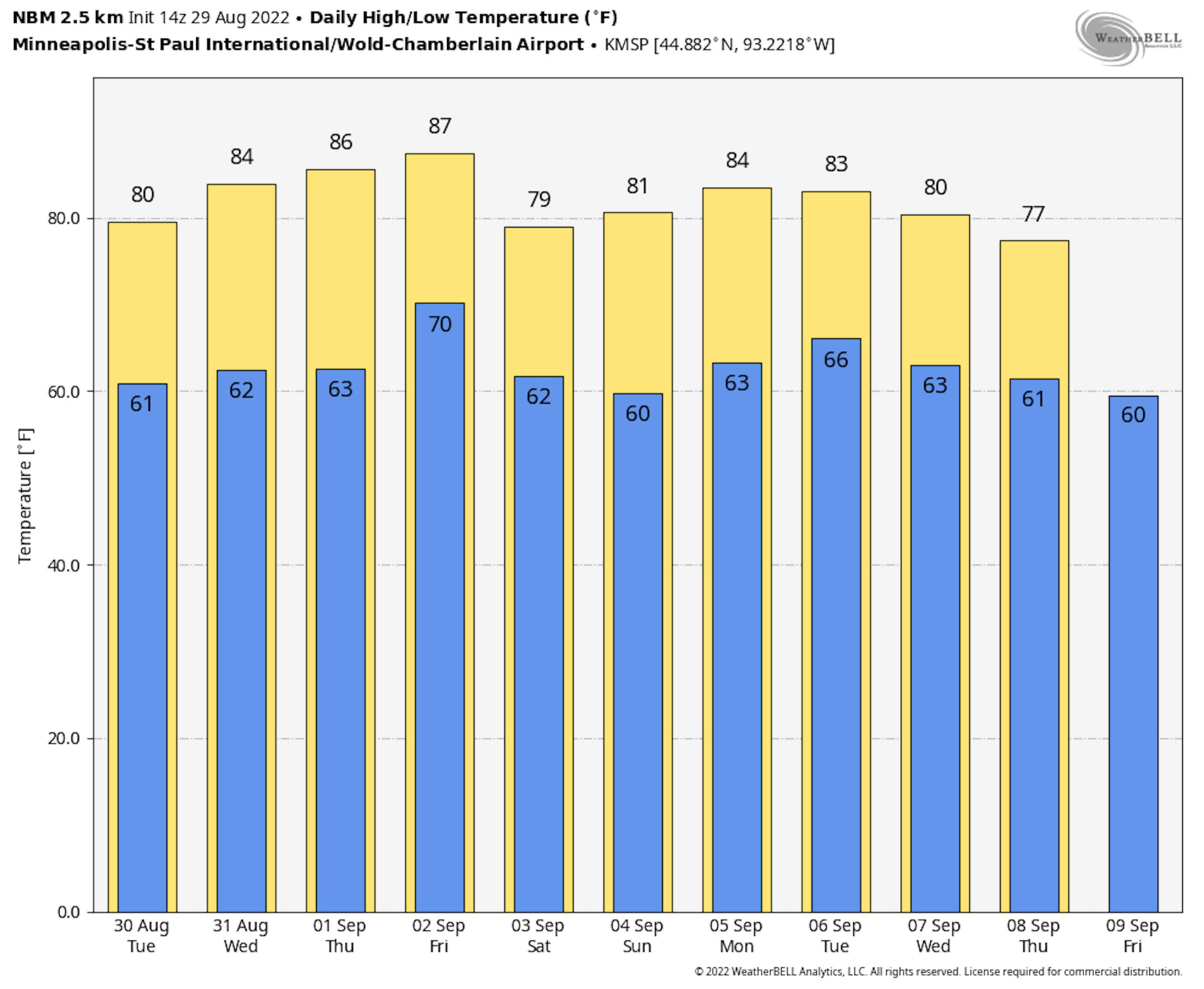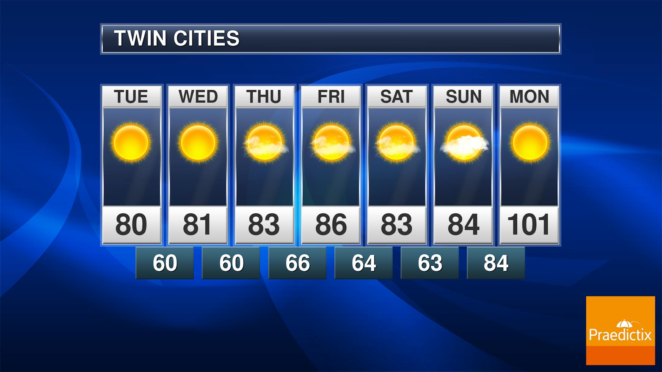 Here's the weather outlook from AM Tuesday to Labor Day Monday. Weather conditions will be quite dry across much of the region and a bubble of high pressure drifts through. Temps will be close to average through midweek, but will warm to well above average levels later in the week as the wind turns to the south. There is a slight chance of PM storms Friday, but the main threat will be south and east of the Twin Cities.